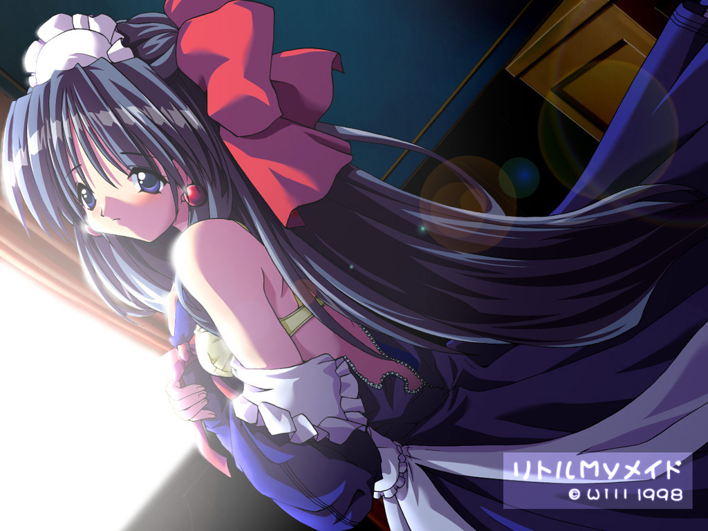 Description: A girl with long hair and a bow on her head is standing in a room with a window and a curtain.