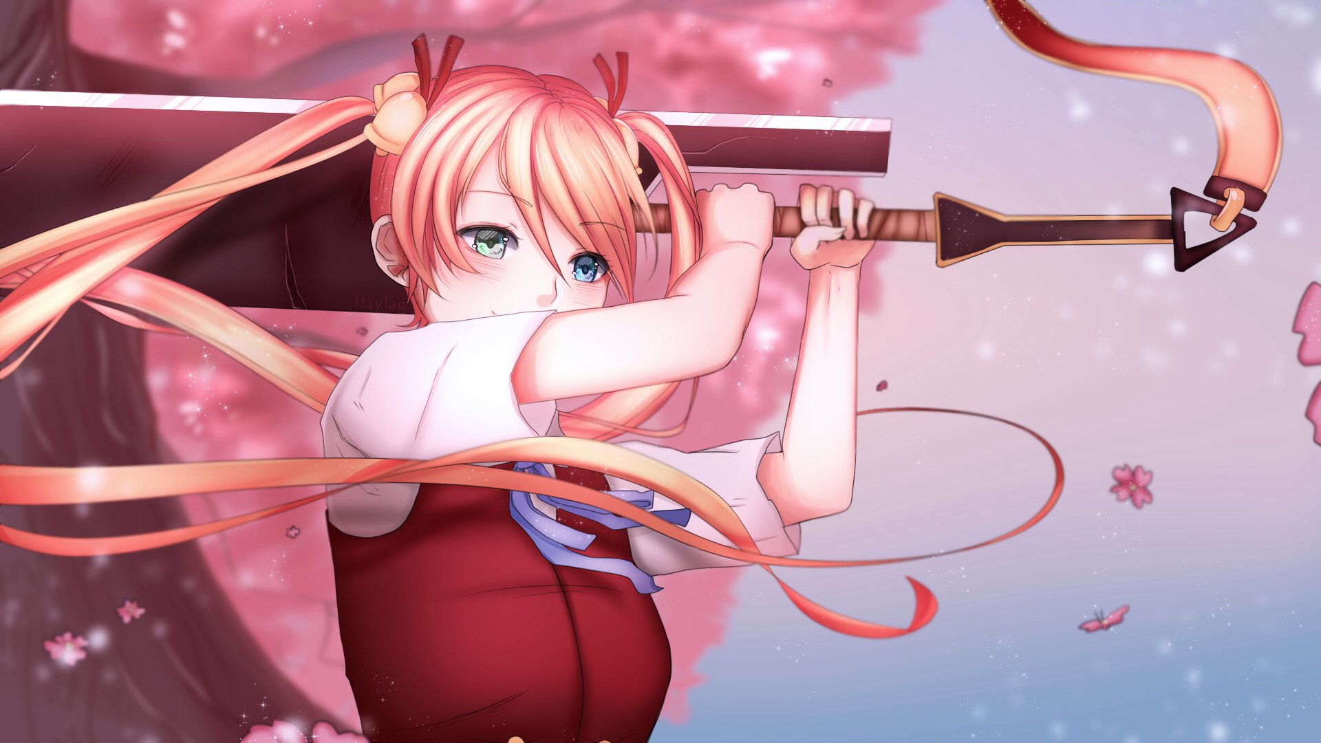 Description: A girl with long hair holding a large sword and a bow in her hand.