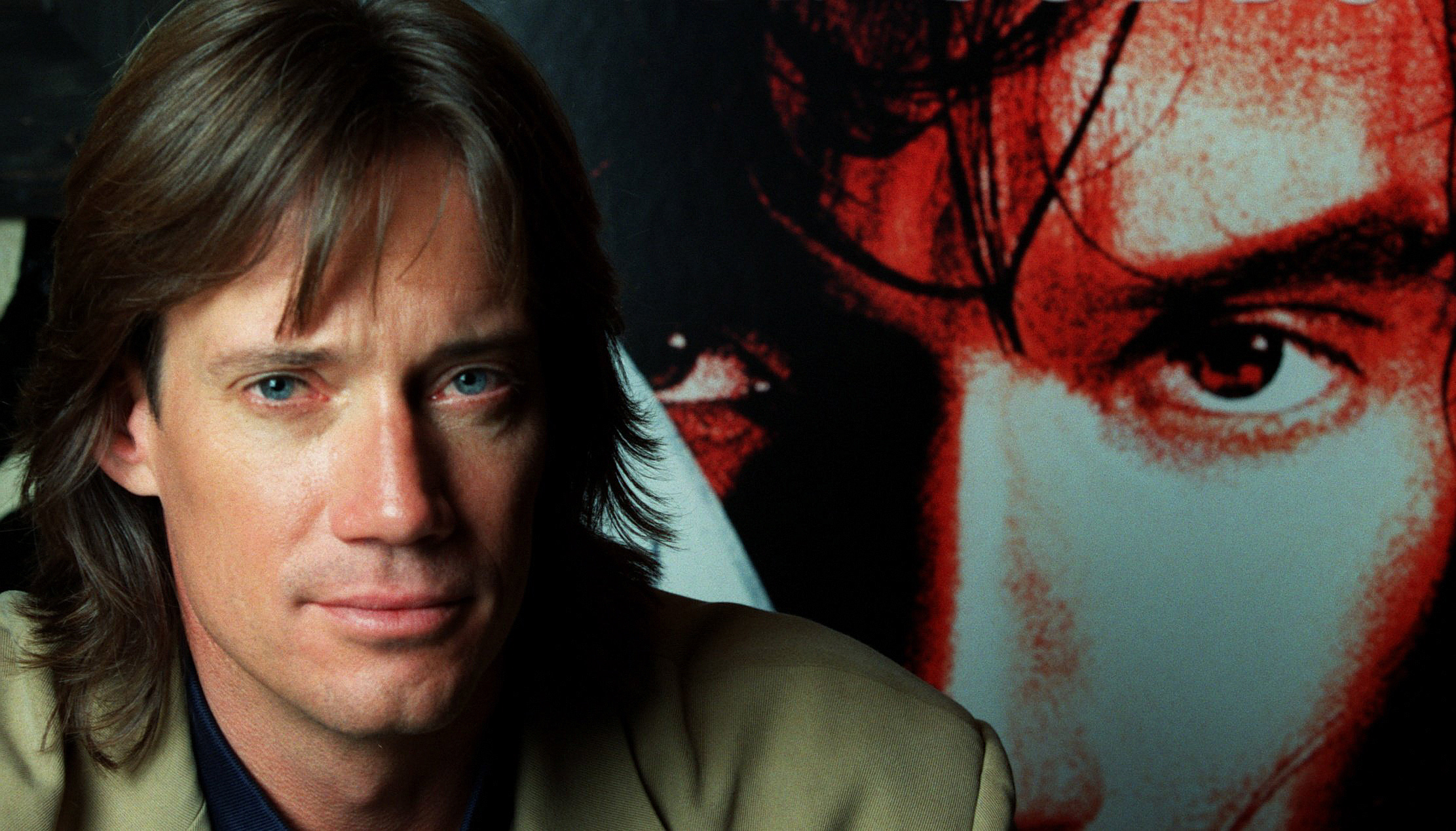 Description: A man with long hair and a jacket on in front of a poster of a man with long hair.
