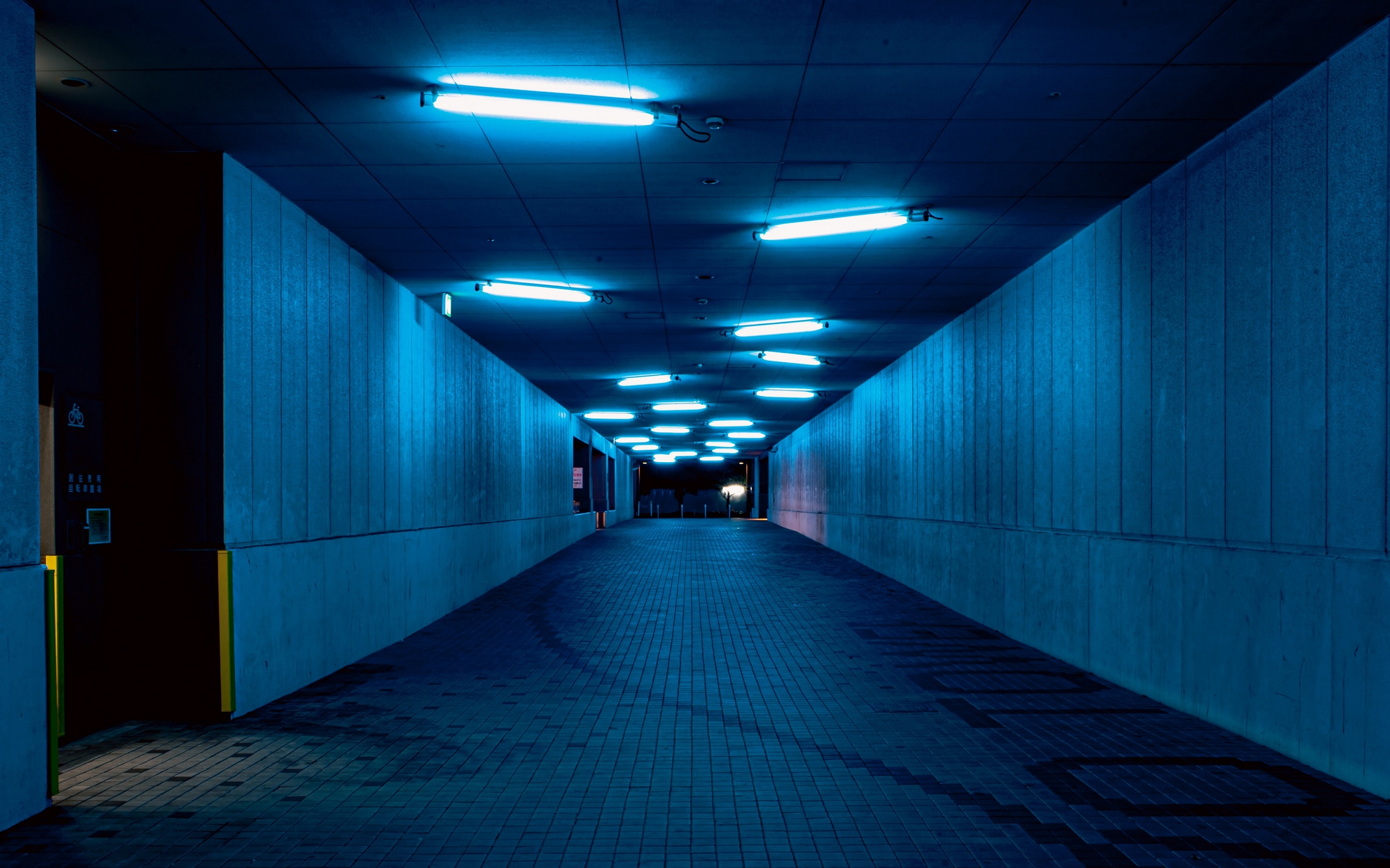 Description: A long hallway with a blue light at the end of it and a tiled floor and walls on both sides.