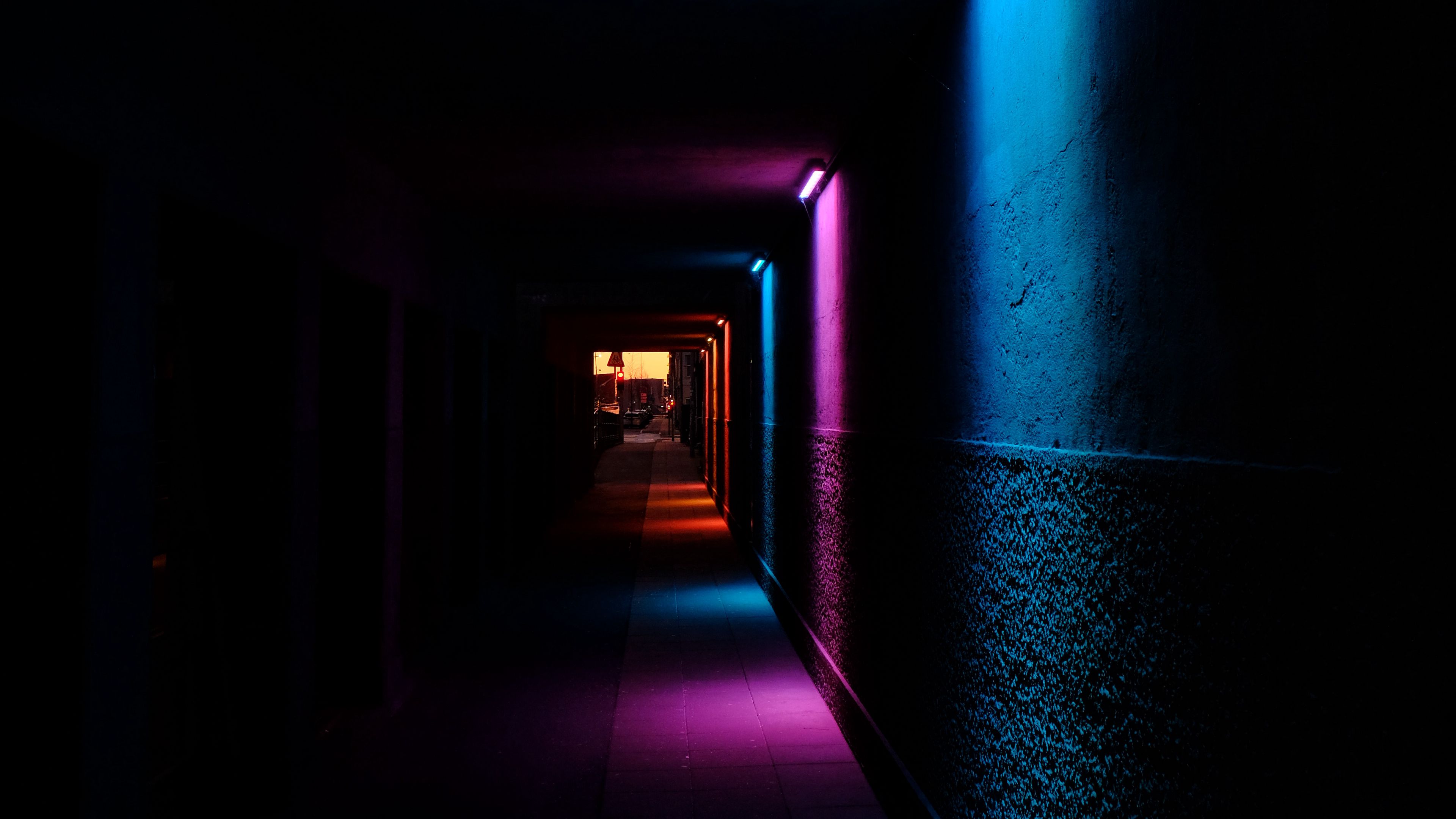 Description: A long hallway with a light at the end of it and a dark hallway with a light at the end of it.