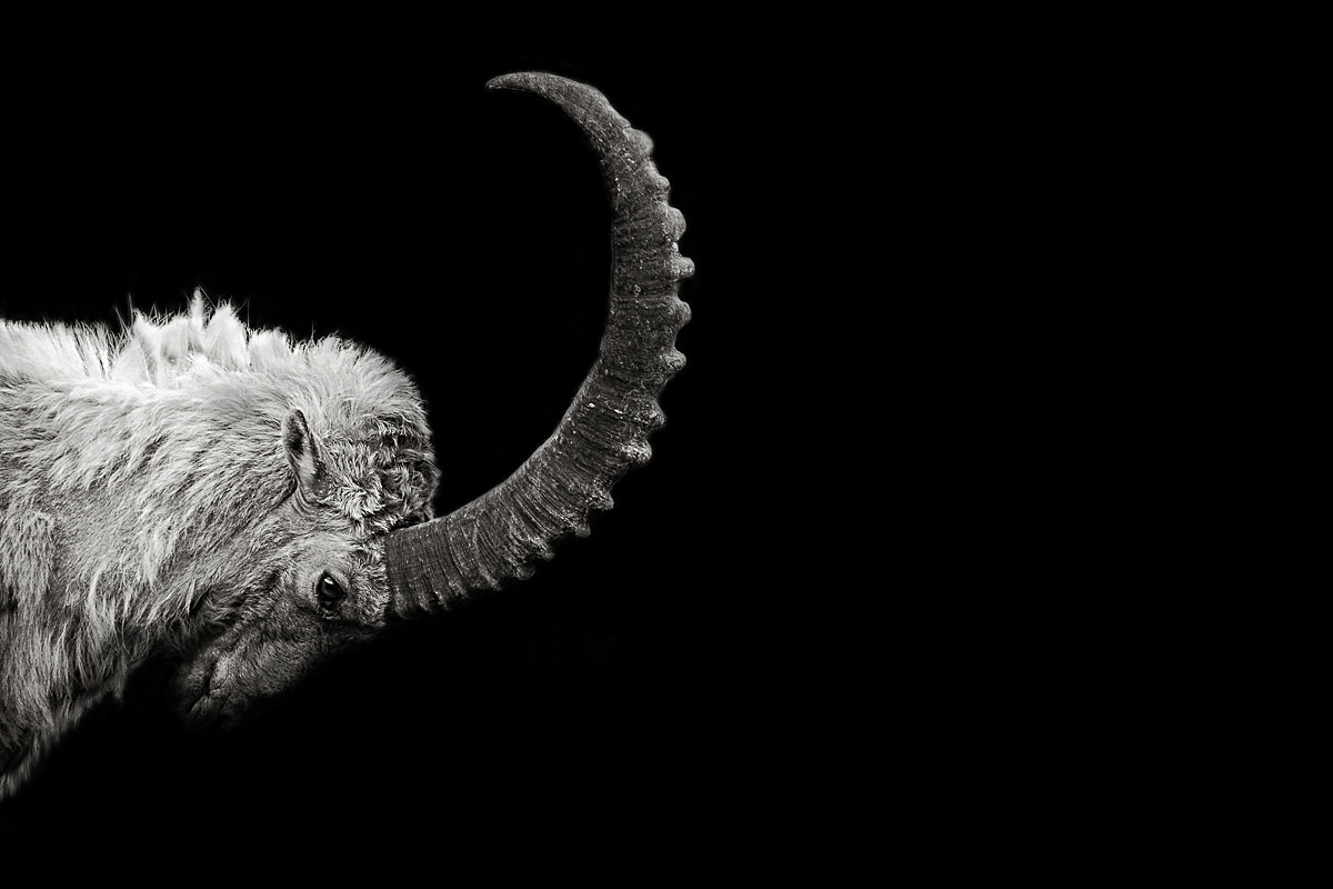 Description: A long horn sheep with large horns standing in the dark with its long horns curled up and a black background.