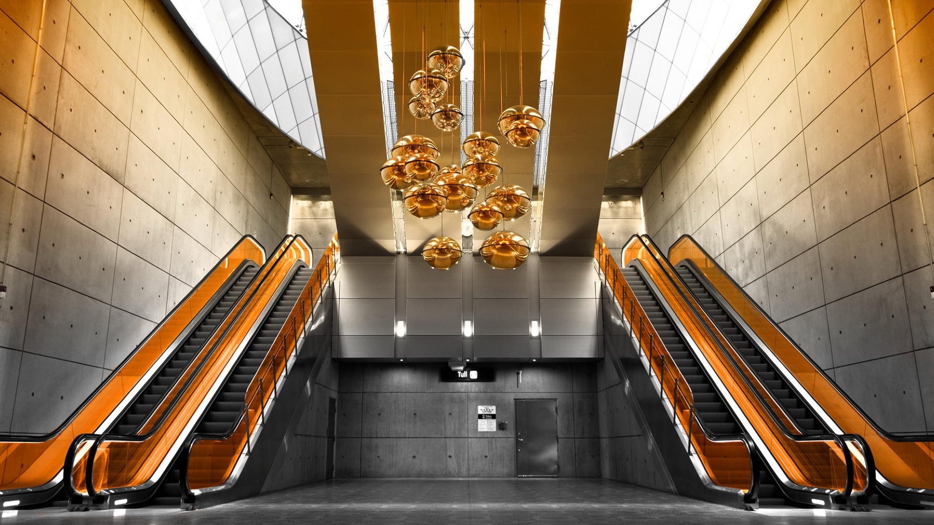 Description: A very long and narrow hallway with a bunch of lights hanging from the ceiling and a set of stairs.