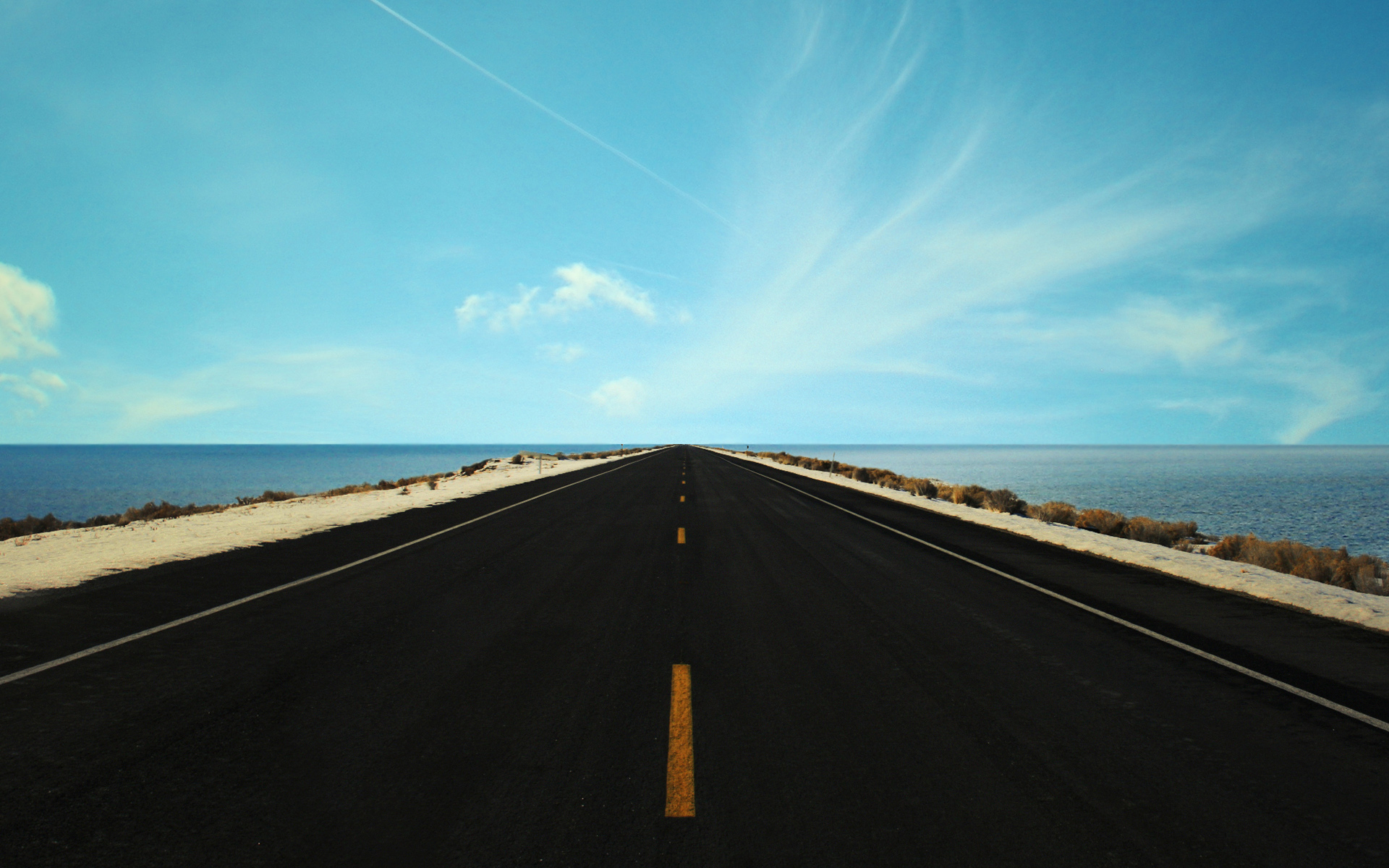 Description: A long road with a blue sky and some clouds above it and a body of water in the distance.