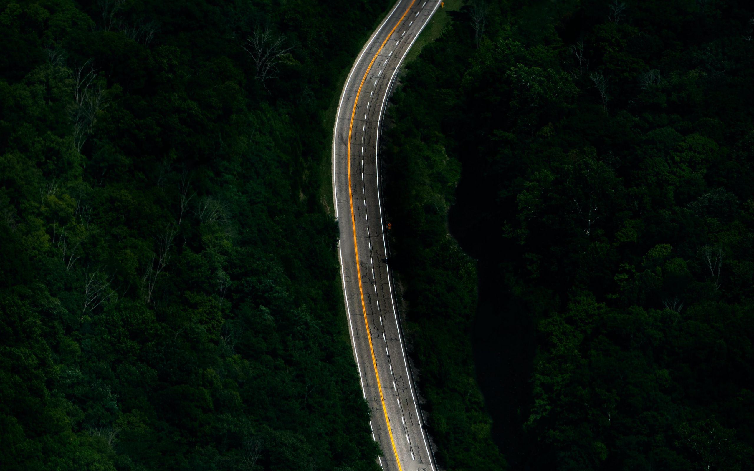 Description: A long road in the middle of a forest with a truck driving down it's side in the middle.