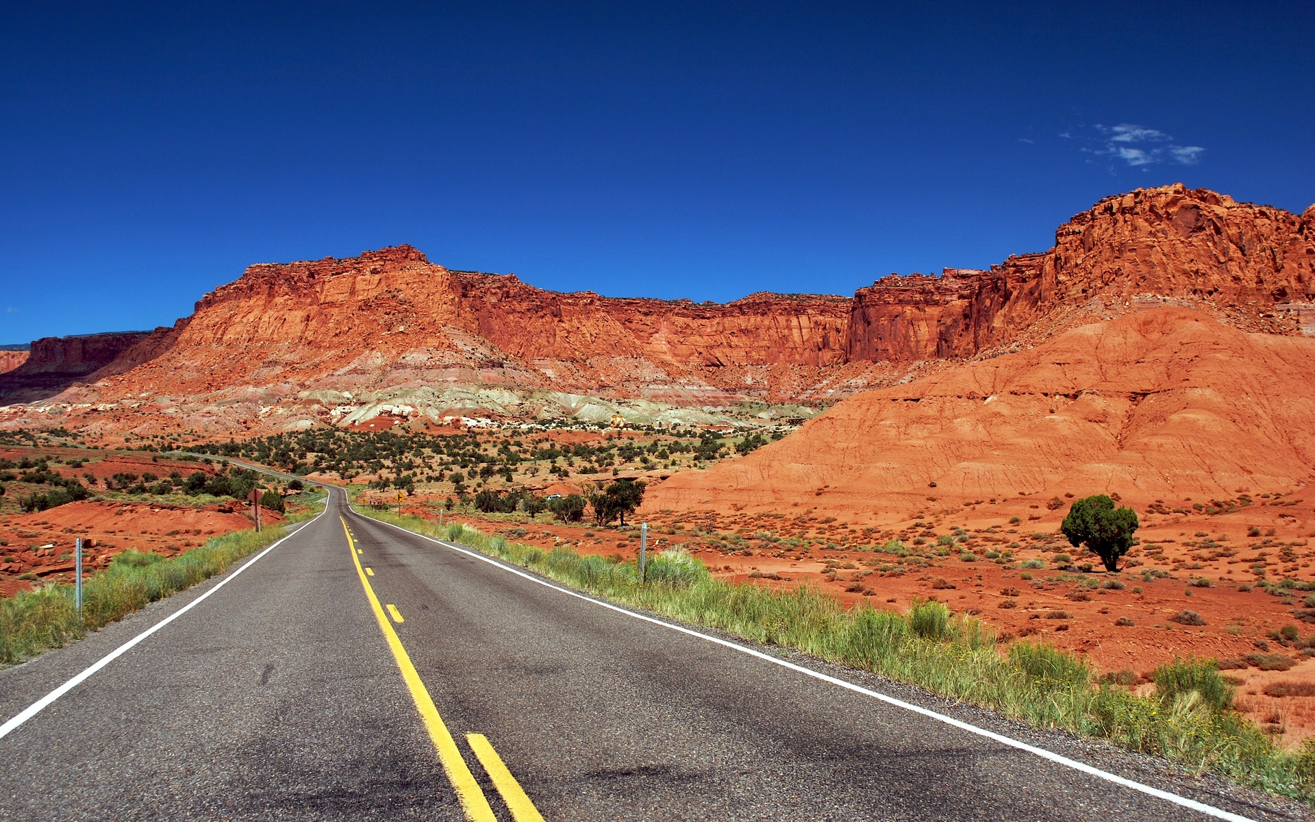 Description: A long road with a mountain in the background and a blue sky above it with a few clouds in the sky.