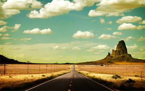 Description: A long road with a mountain in the background and a sky with clouds above it and a fence in the foreground.