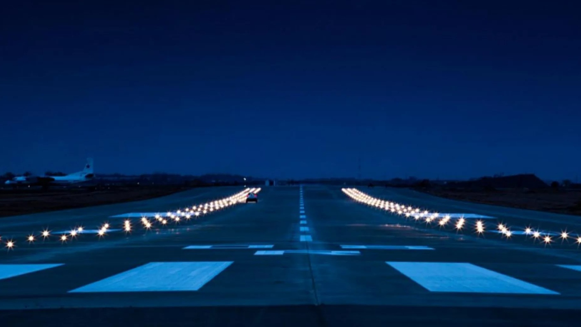Description: A long road with lights on it at night time with a plane in the distance in the distance and a plane in the distance.