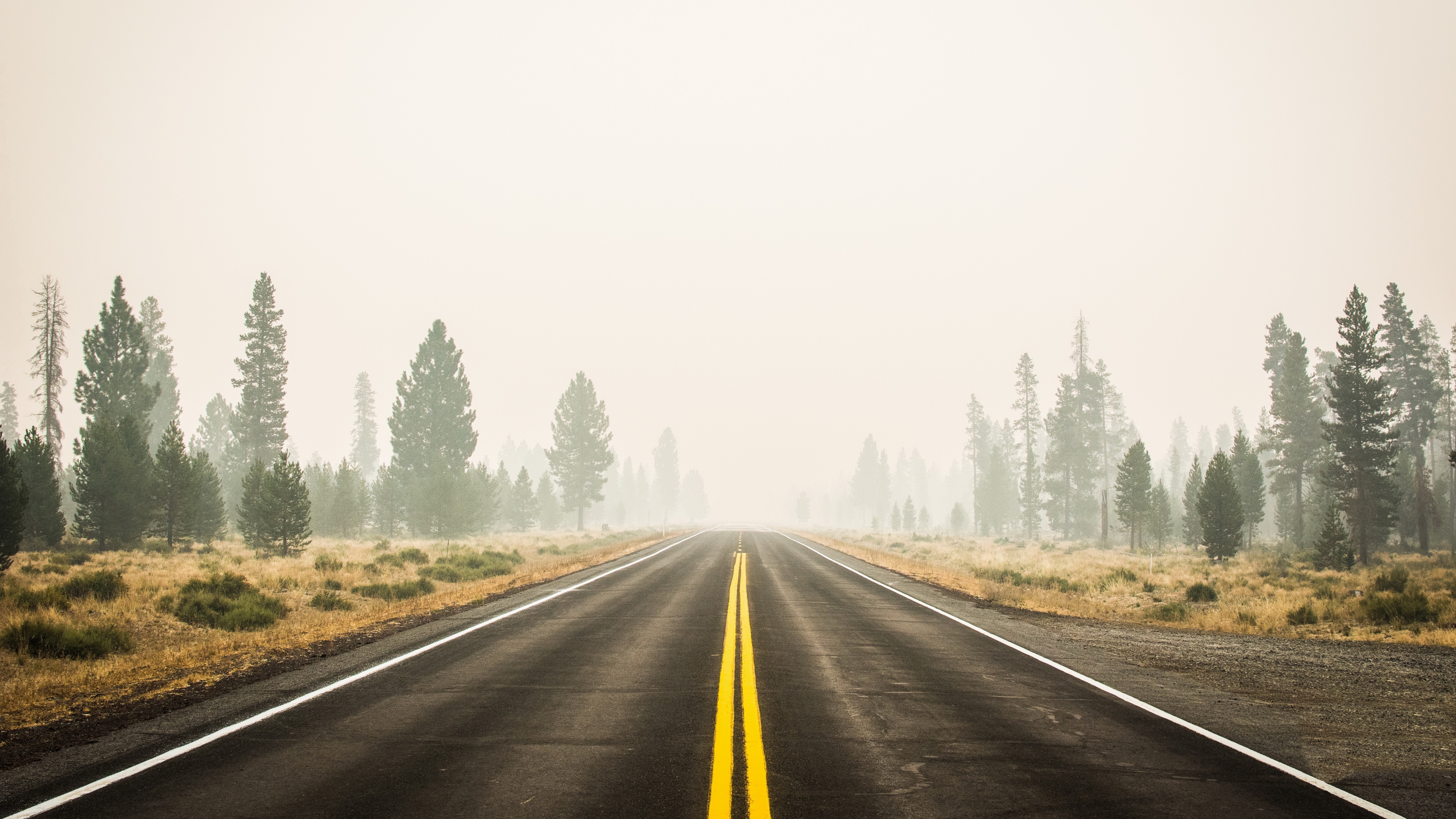 Description: A long road with a yellow line on the side of it in the middle of a field with trees.