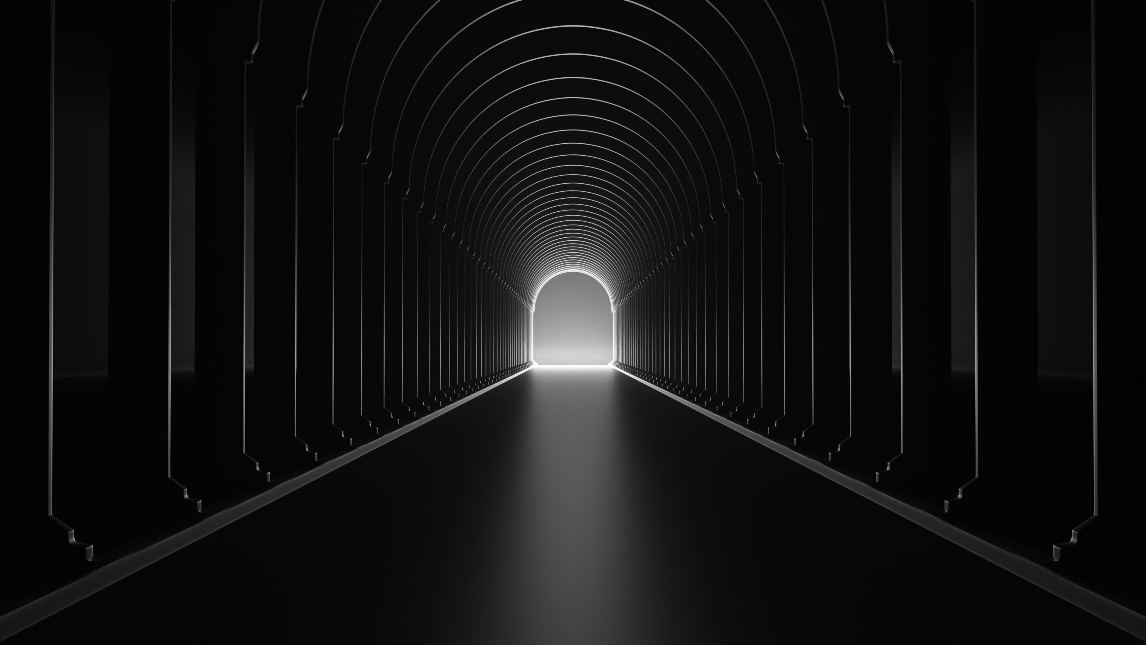 Description: A long tunnel with a light at the end of it and a long hallway leading to the end of the tunnel.