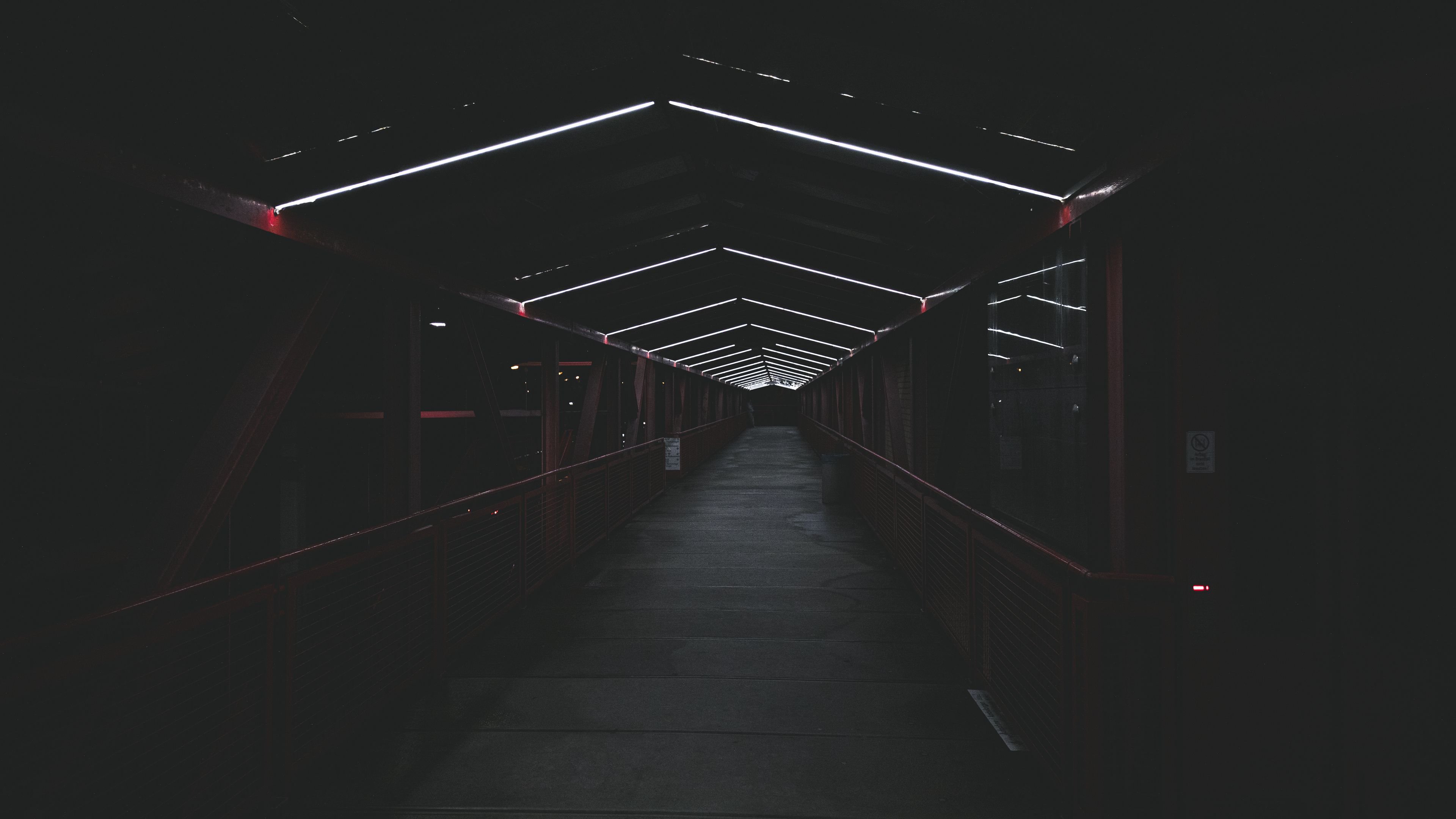 Description: A long walkway with a red light at the end of it in the dark night time.