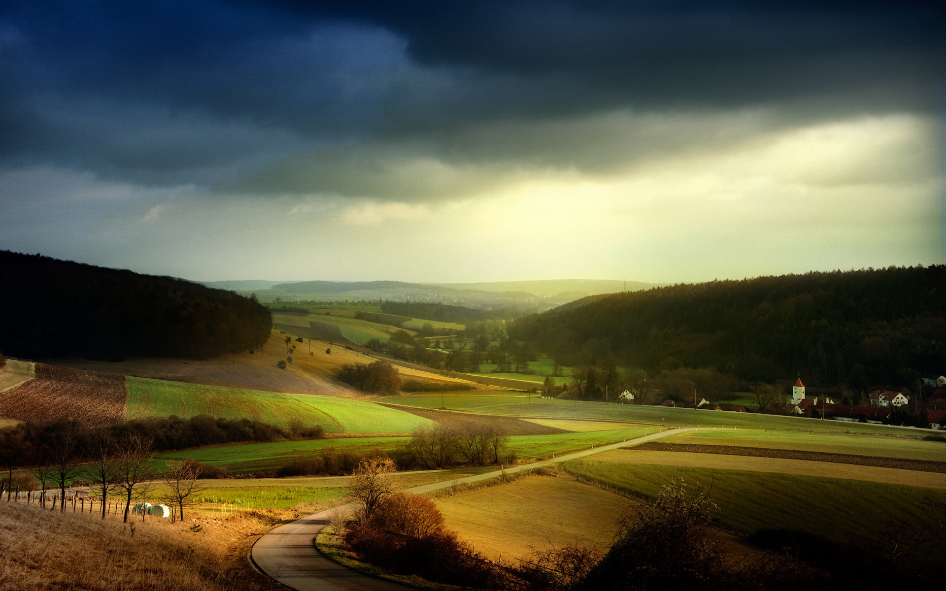 Description: A road winding through a lush green countryside under a cloudy sky with a sunbeam in the distance and a farm in the foreground.