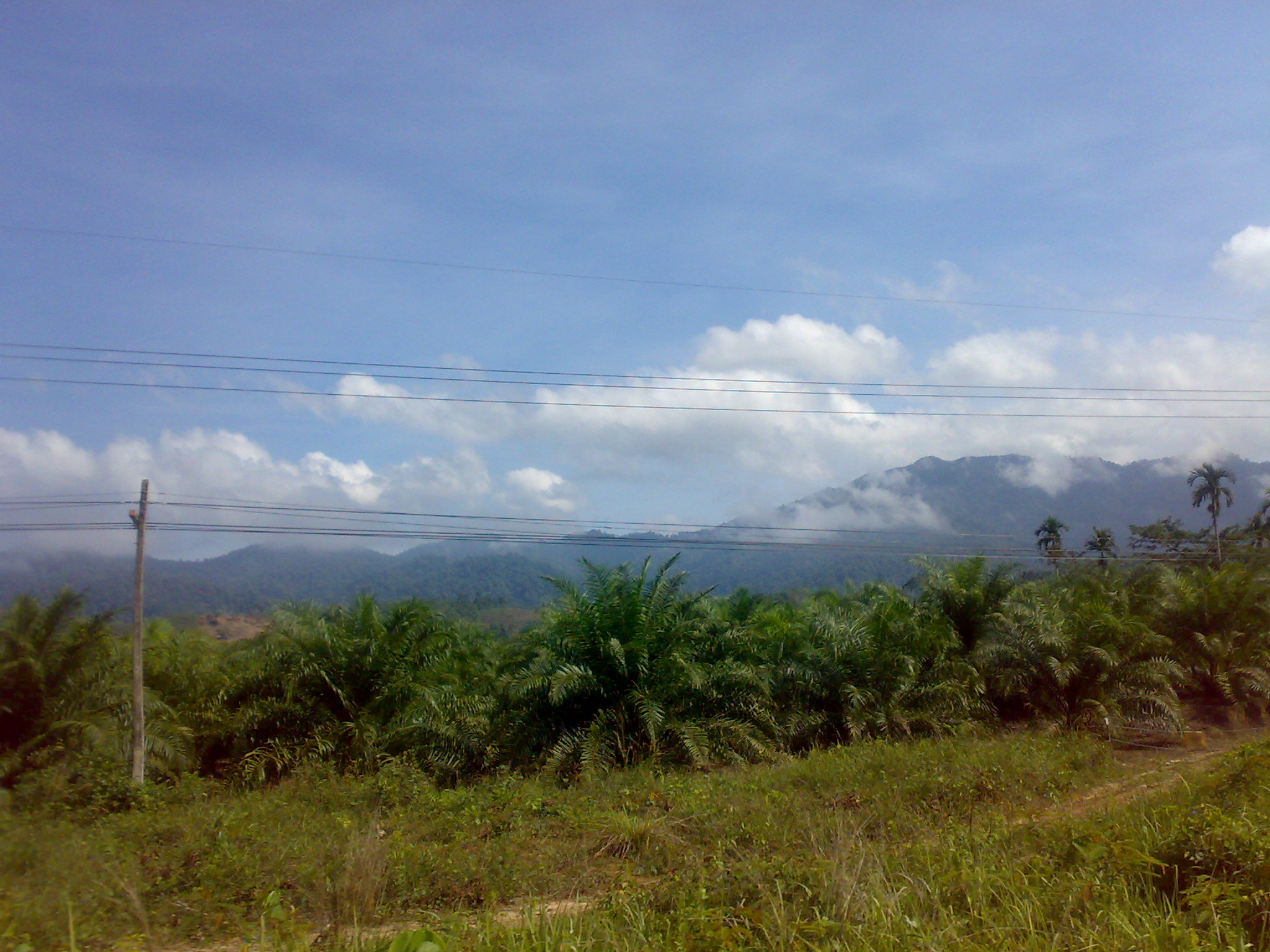 Description: A lush green field with a mountain in the background and clouds in the sky above it.