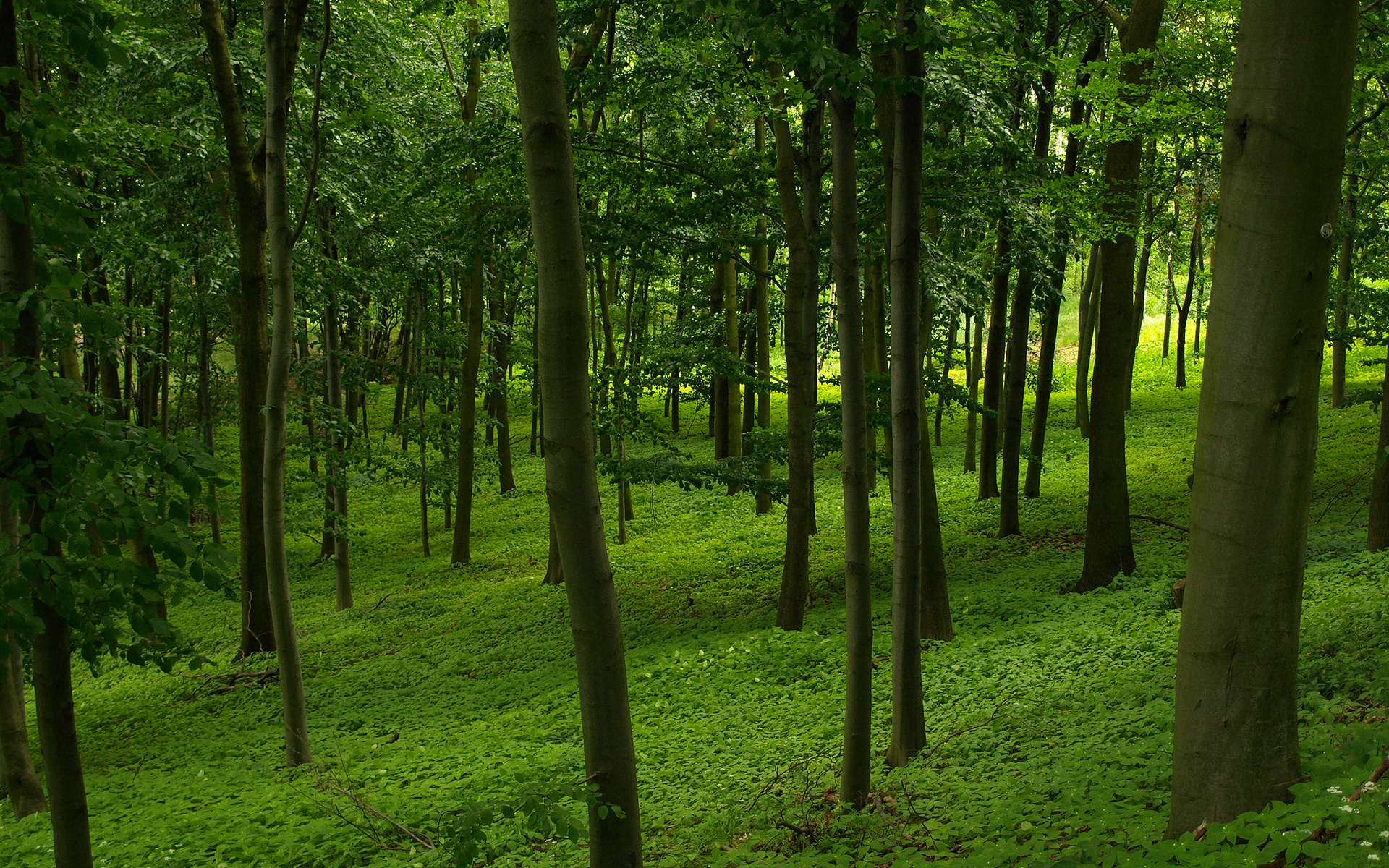 Description: A lush green forest filled with lots of trees and grass covered ground with a bench in the middle of the forest.