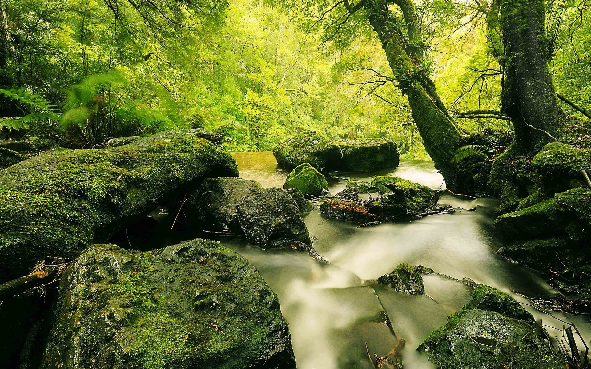 Description: A stream running through a lush green forest filled with rocks and trees.