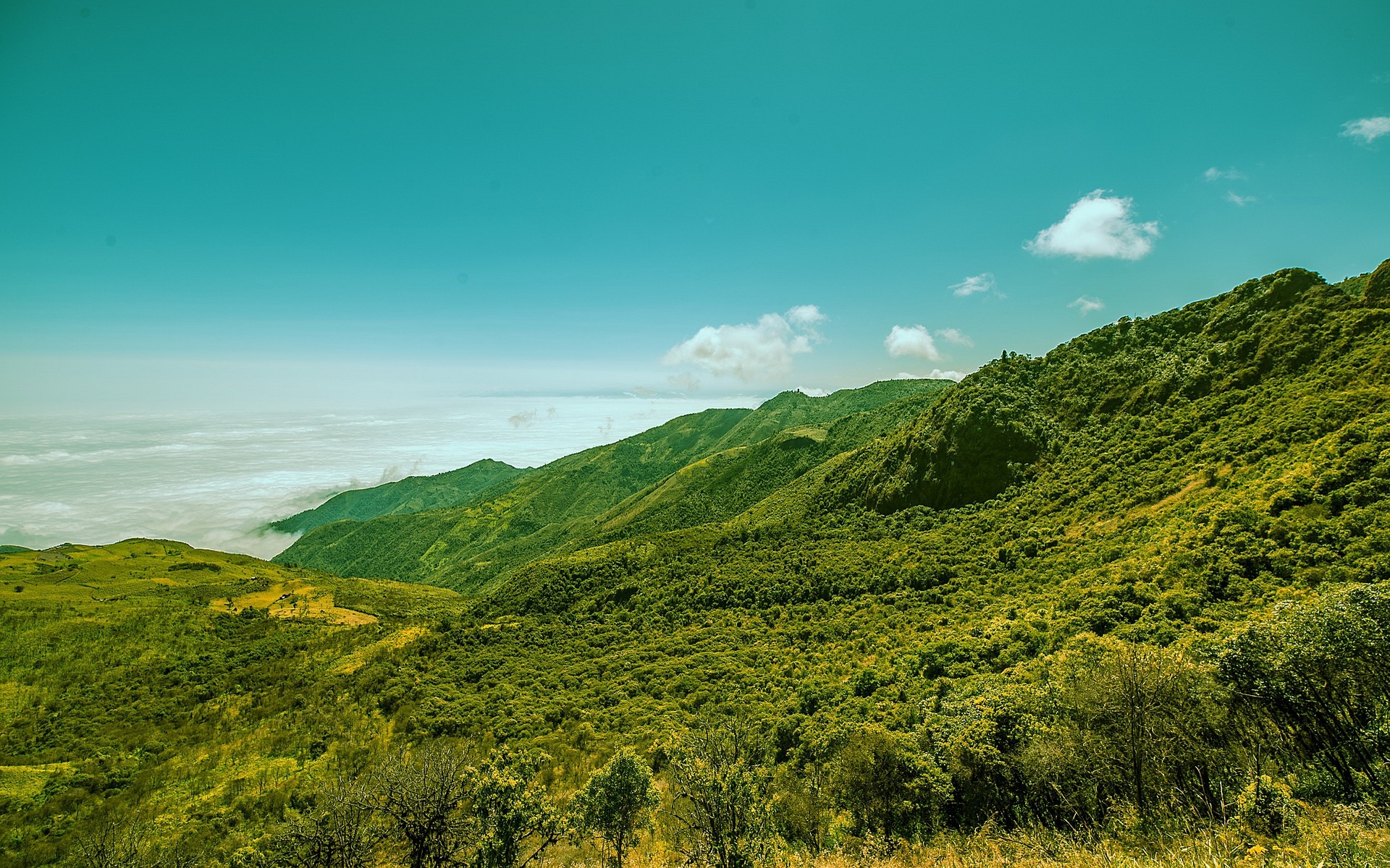 Description: A lush green hillside with a few clouds in the sky above it and a few trees on the side.