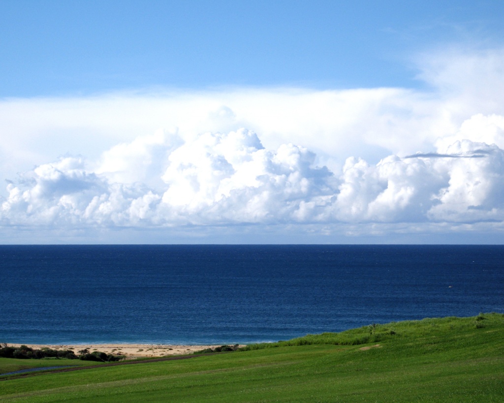 Description: A large body of water sitting next to a lush green field on top of a lush green hillside under a blue sky.