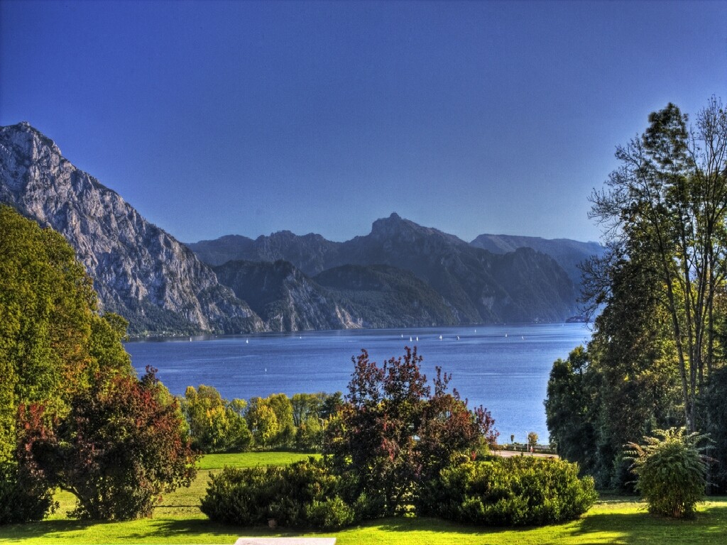 Description: A bench sitting on top of a lush green field next to a lake and mountains in the background with a bench in the foreground.