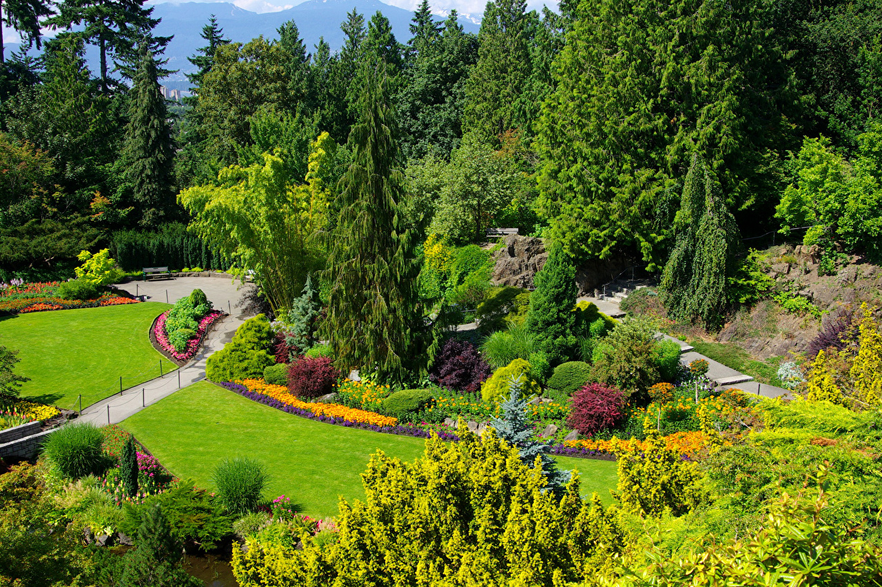 Description: A lush green park with a walkway and trees in the background and a lush green field with flowers and trees.