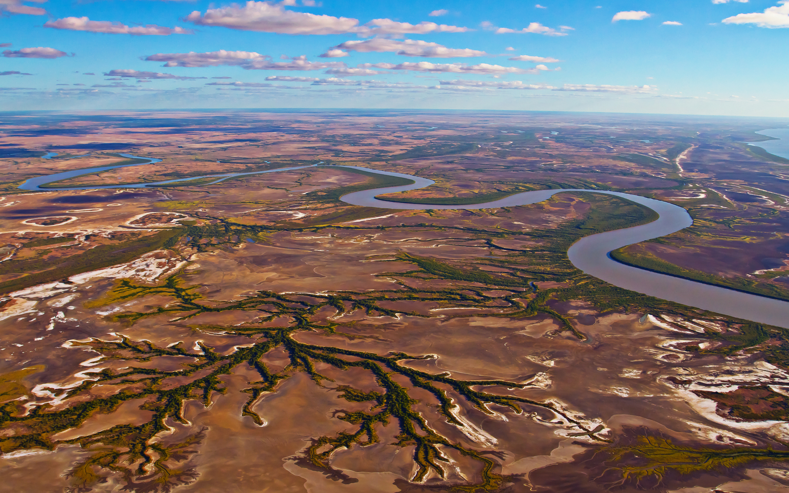Description: A river running through a lush green countryside under a blue sky with clouds in the background and a river running through the center of the picture.
