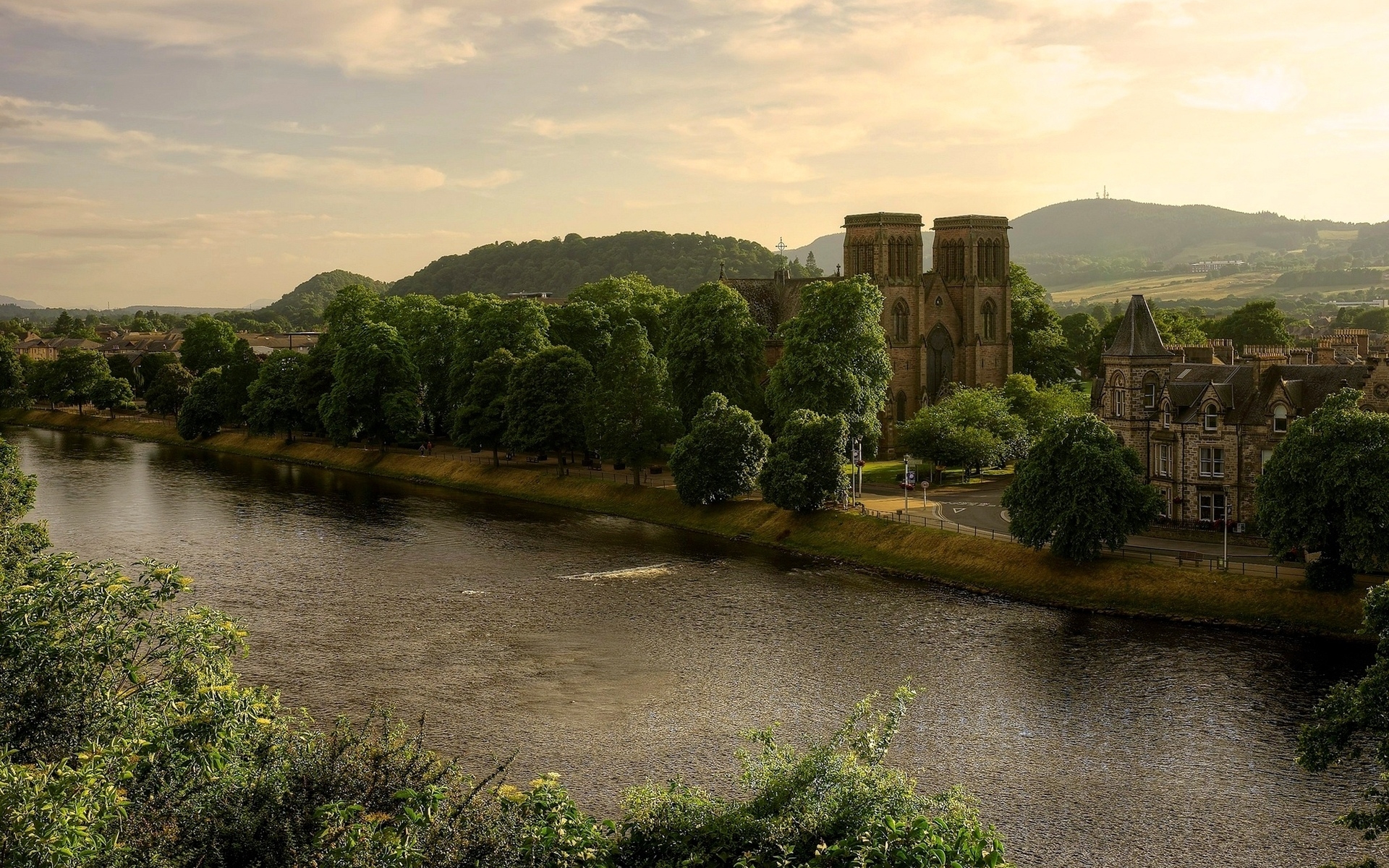 Description: A river running through a lush green countryside next to a lush green forest covered hillside under a cloudy sky.