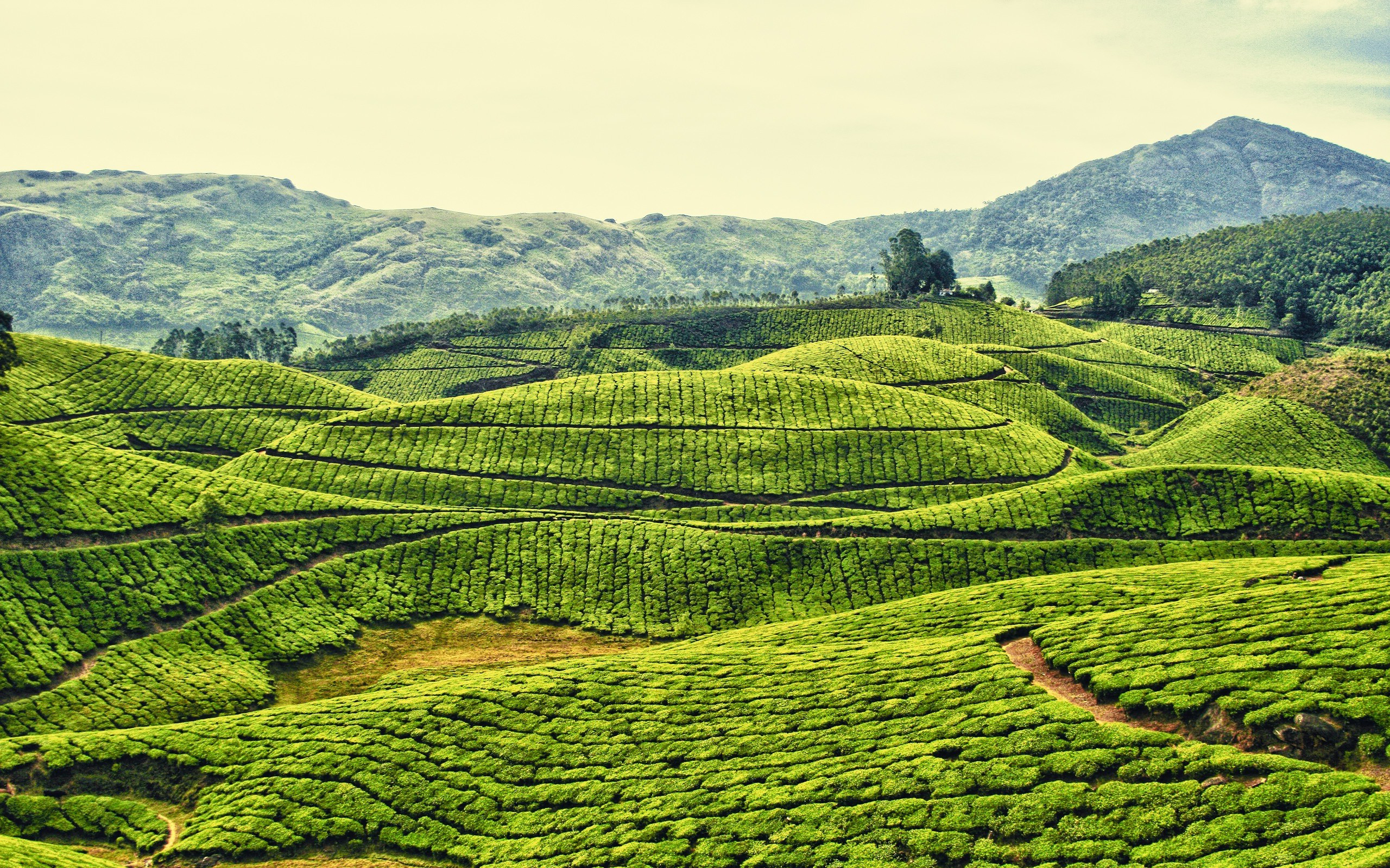 Description: A lush green hillside with a few trees on it and mountains in the background with a few clouds in the sky.