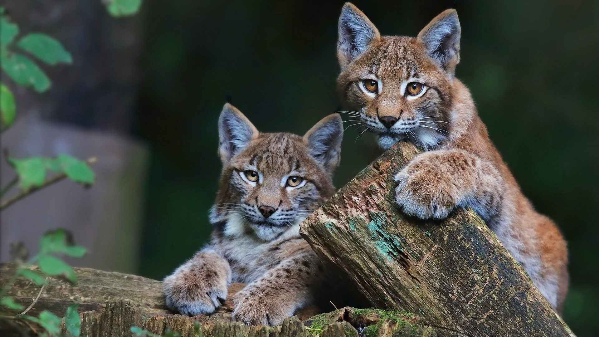 Description: Two young lynx cubs sitting on a tree stump in the woods looking at the camera with a curious look on their faces.