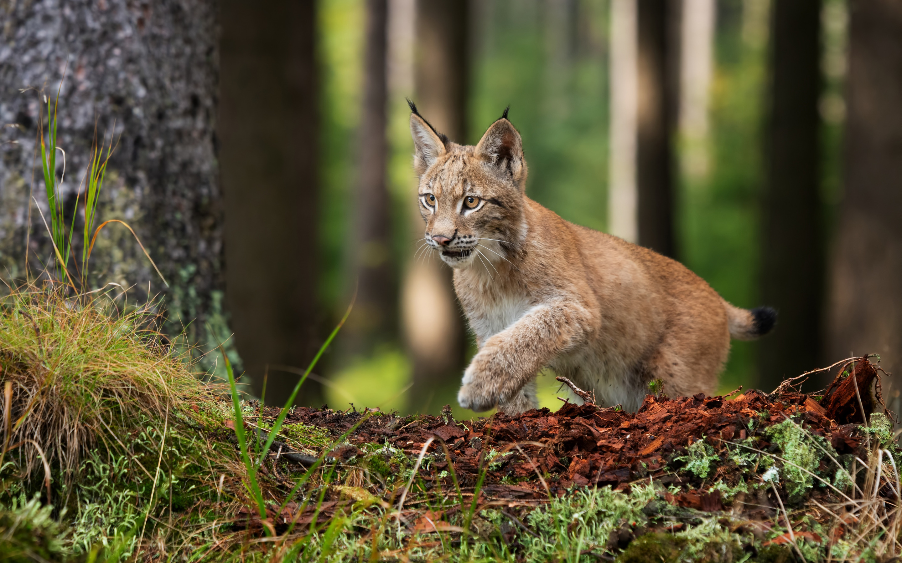 Description: A small lynx walking through a forest filled with trees and grass and dirt on the ground.