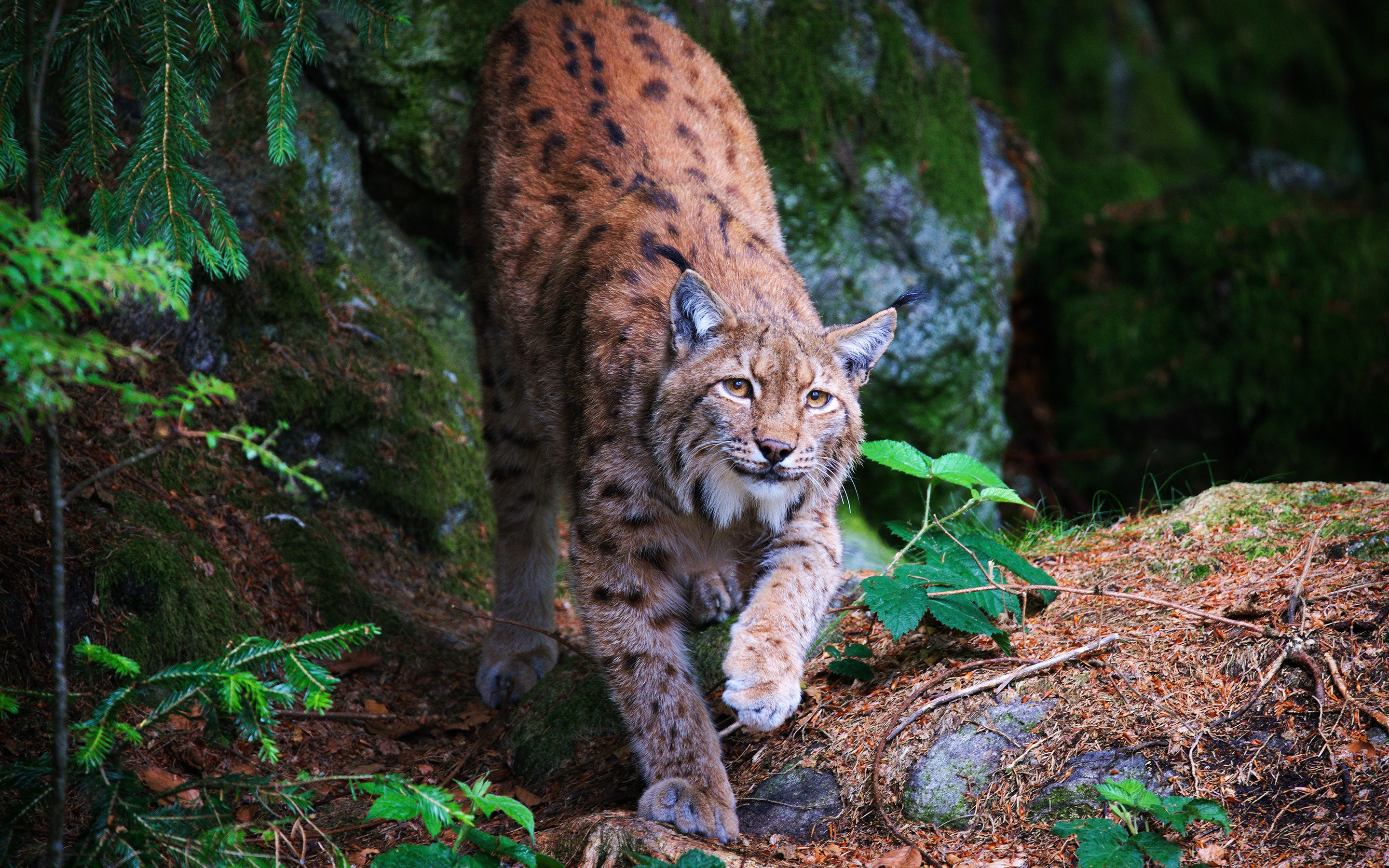 Description: A lynx walking through a forest with green leaves on the ground and rocks in the background.