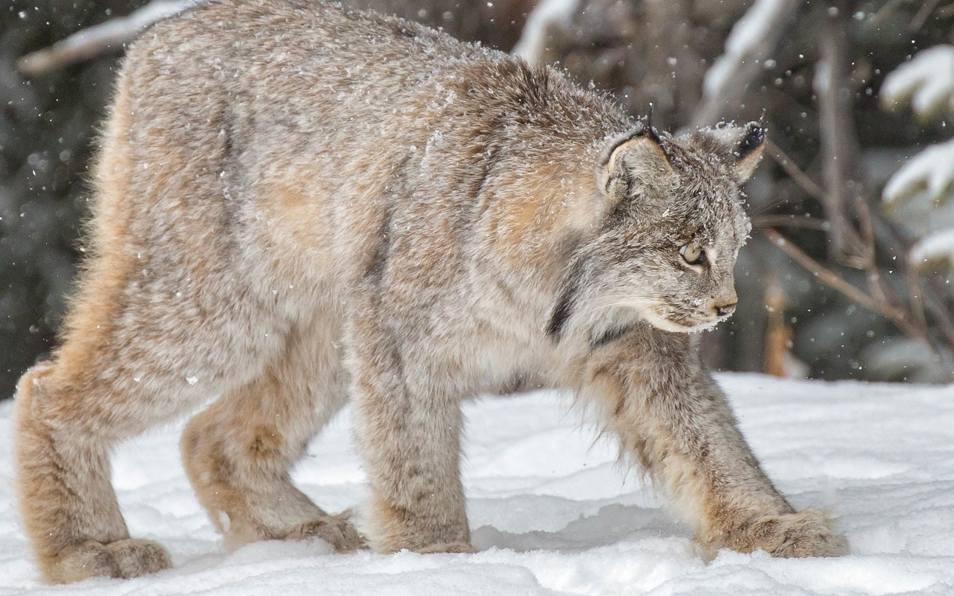 Description: A lynx walking through the snow in a wooded area with trees in the background and snow falling on the ground.