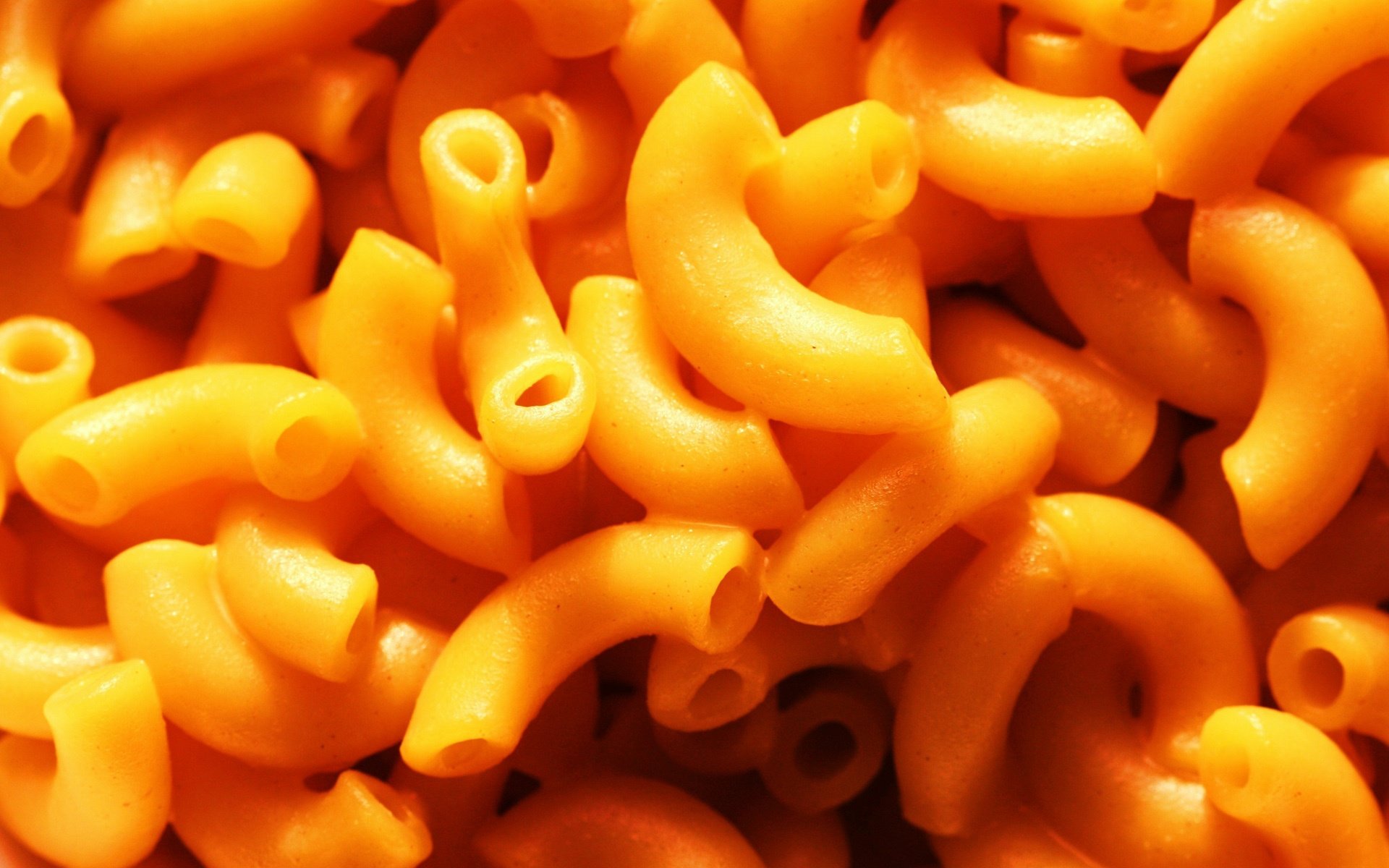 Description: A close up of a pile of macaroni and cheese noodles with a fork in it's mouth.