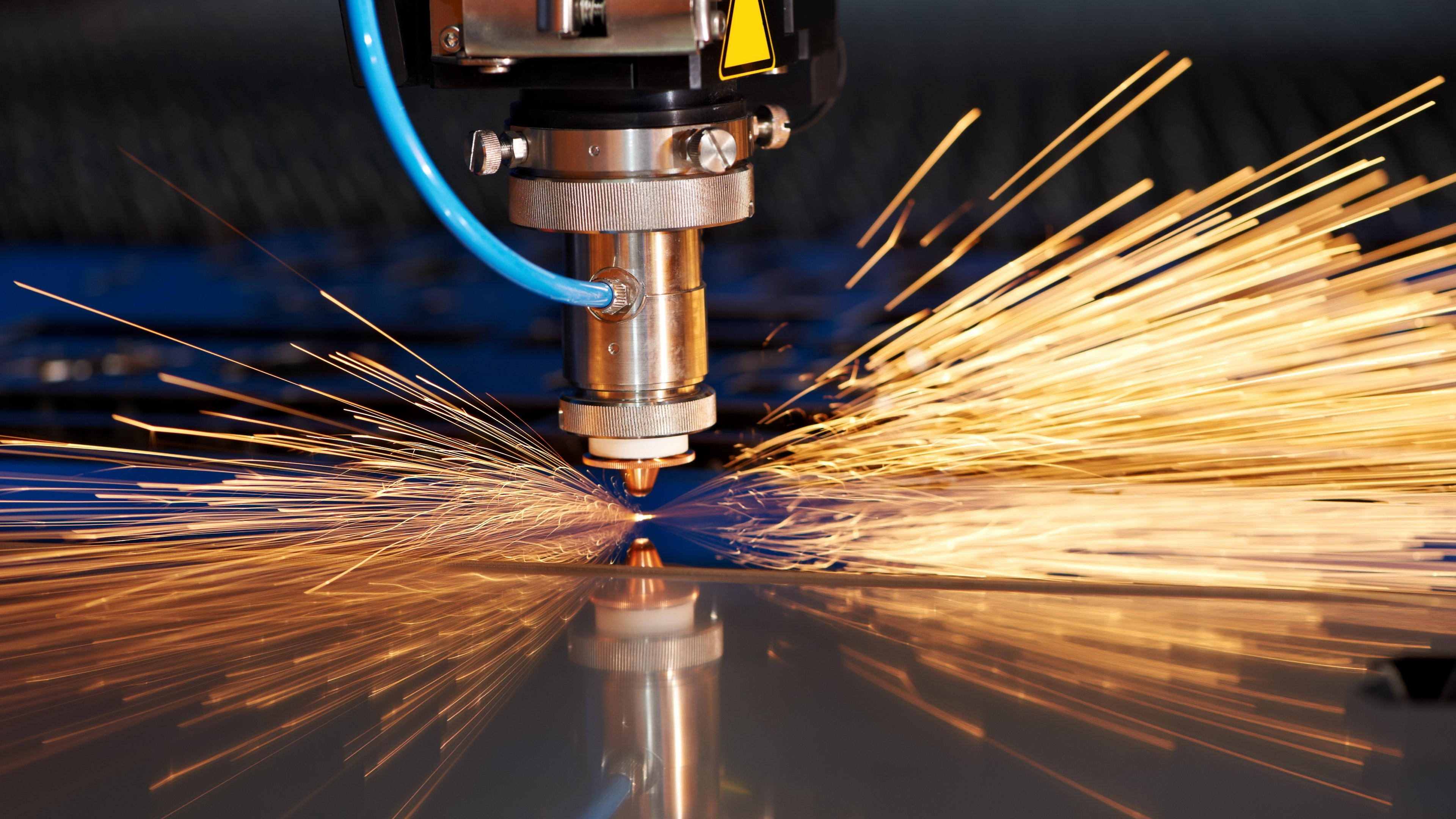 Description: A machine cutting a piece of metal with sparks coming out of it's center and a blue hose running through it.