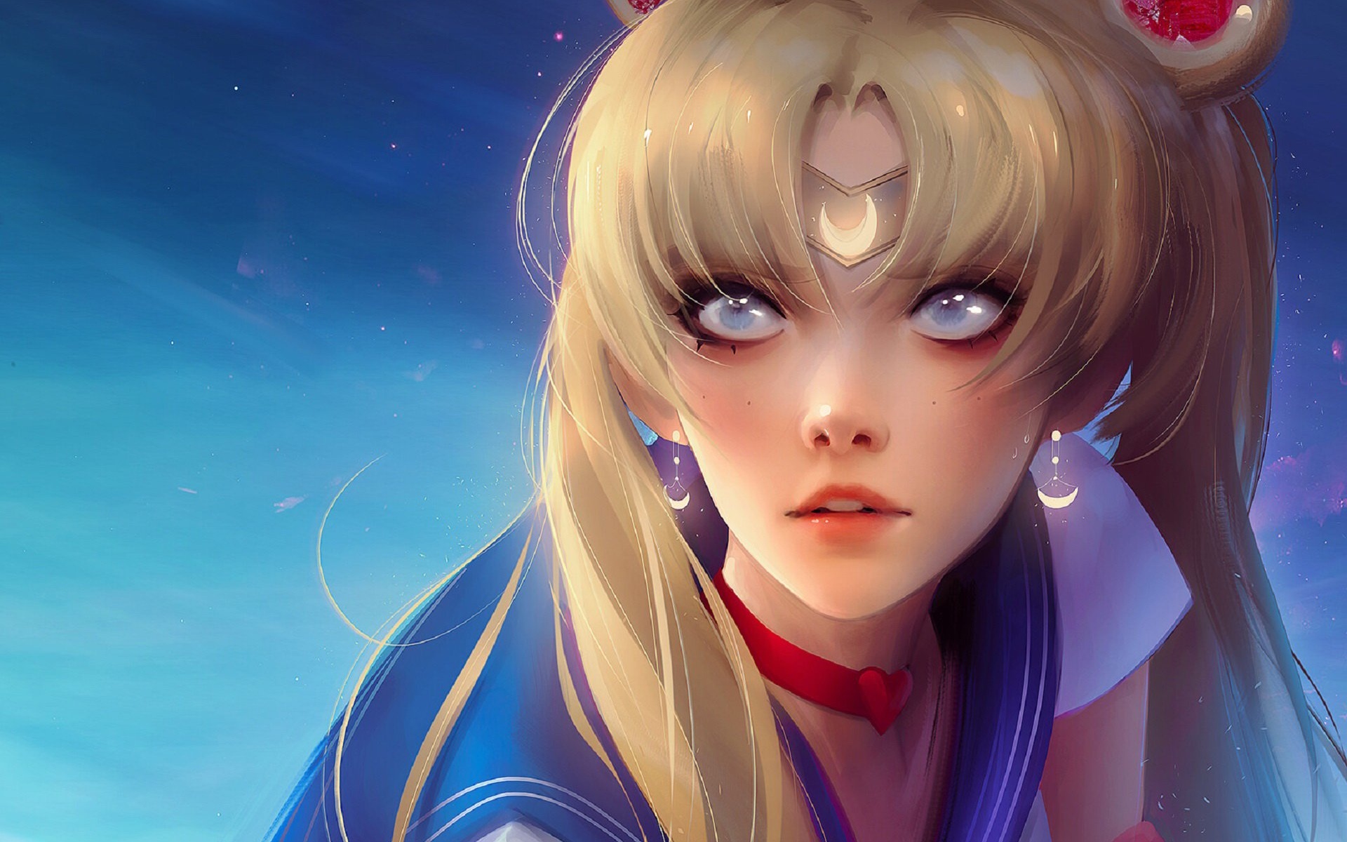 Description: A woman with a cat ears and a blue shirt and red bow tie and a blue sky background with clouds.