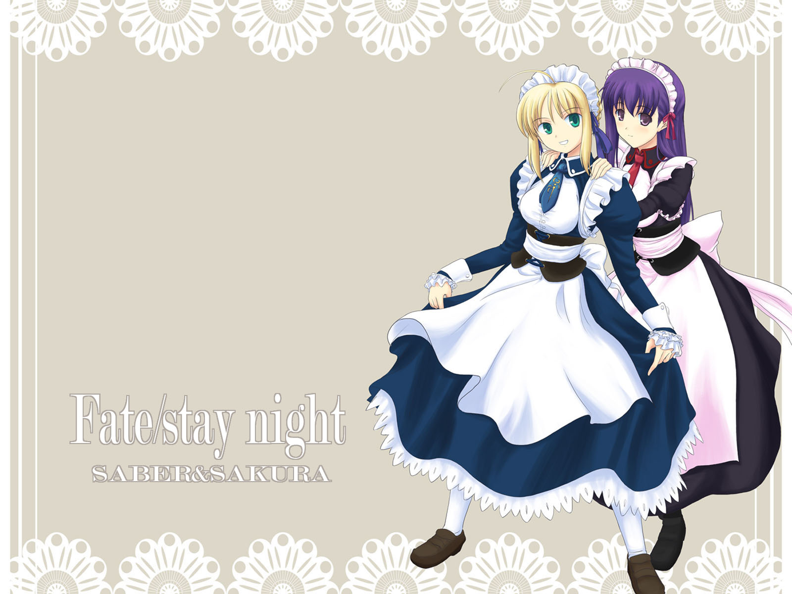 Description: Two anime characters are dressed in maid outfits and holding hands together.