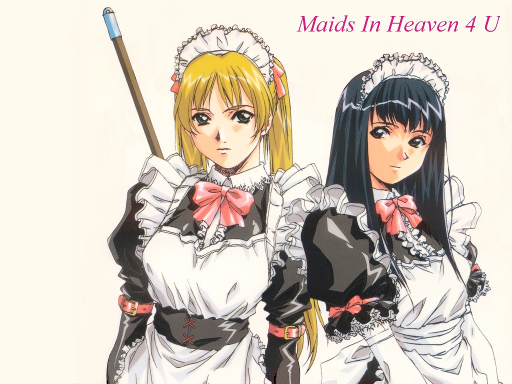 Description: Two anime girls dressed in maid outfits with a broom in their hands and a caption that reads maids in heaven.