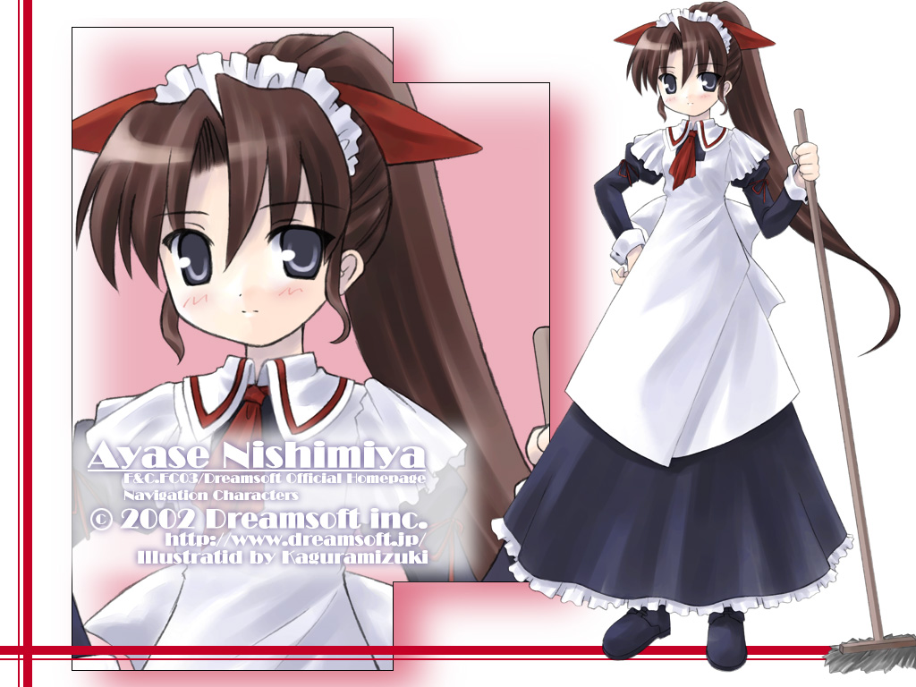 Description: A girl in a maid outfit with a broom and a magazine cover behind her that says xyase nishima.