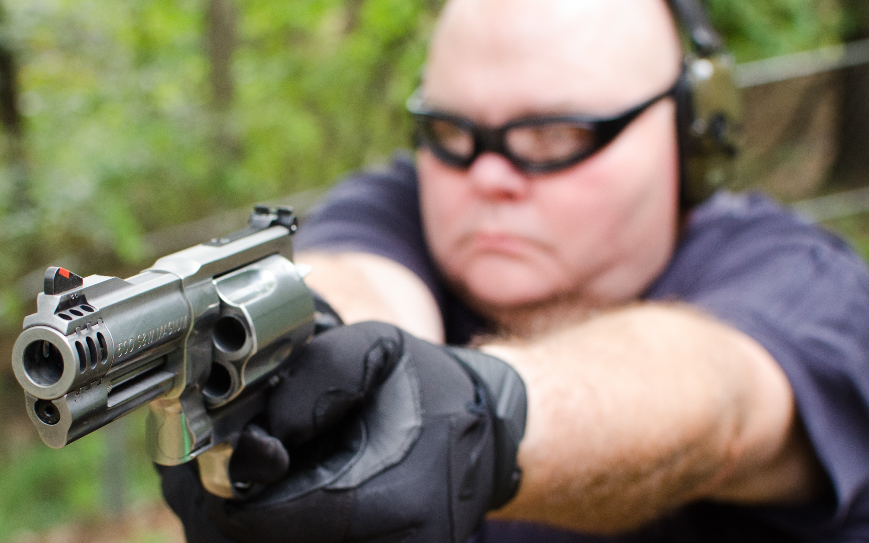 Description: A man in black shirt holding a gun in his hand and wearing black gloves and glasses on his head.