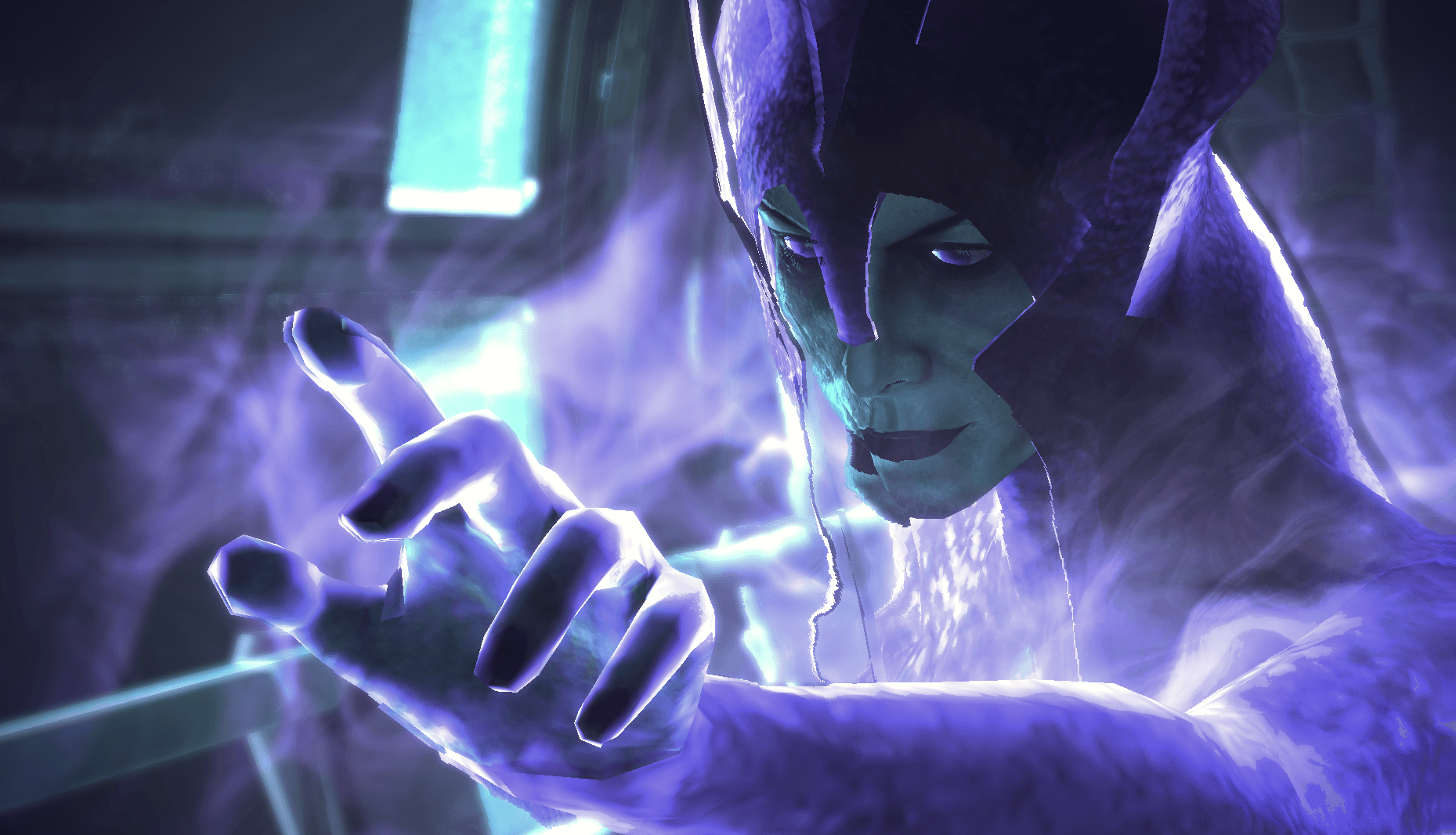 Description: A male character in a purple costume holding a cell phone in his hand and looking at the screen with a serious look on his face.