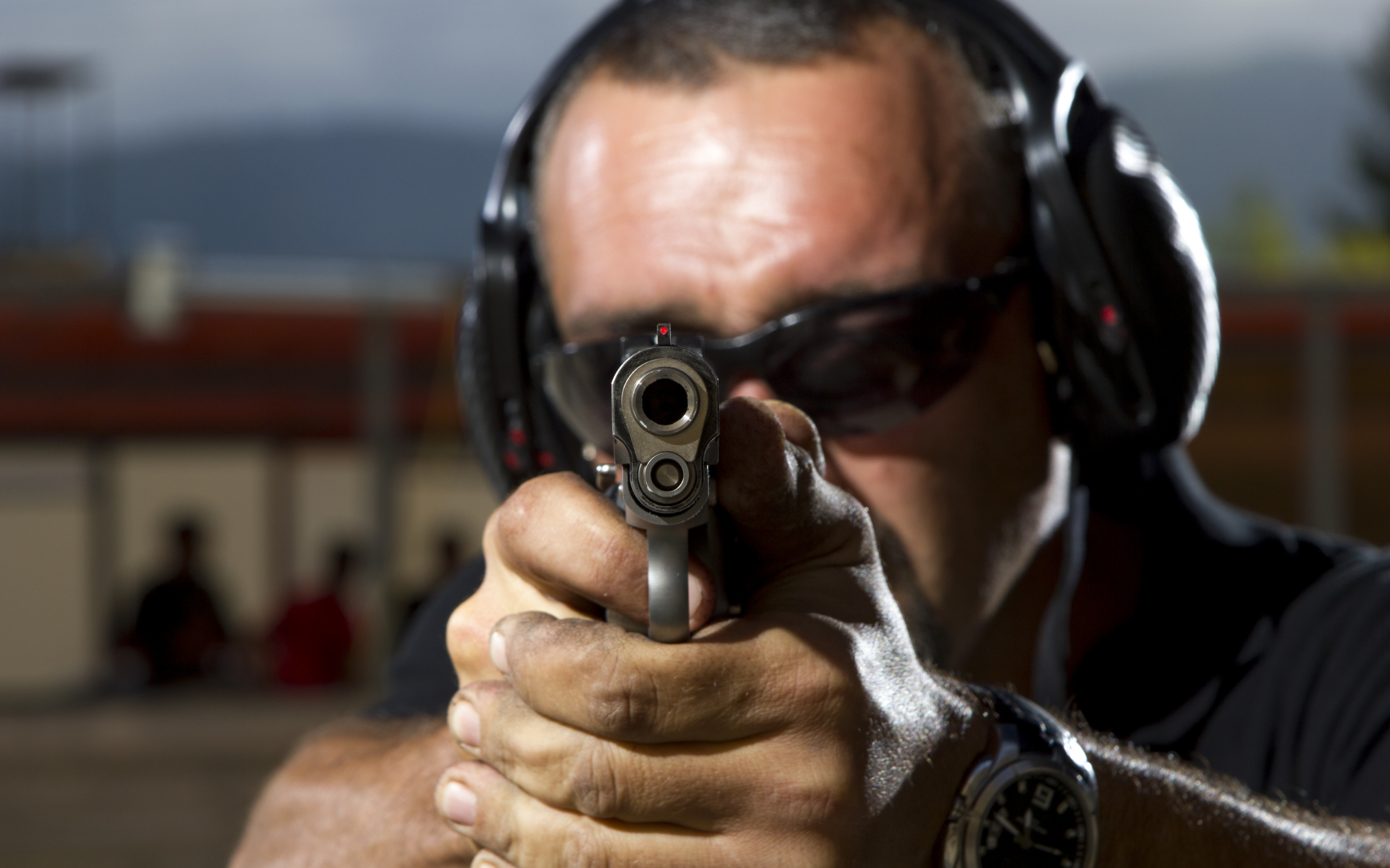 Description: A man holding a gun and aiming it at the camera with a headphone on his ear and a gun in his hand.