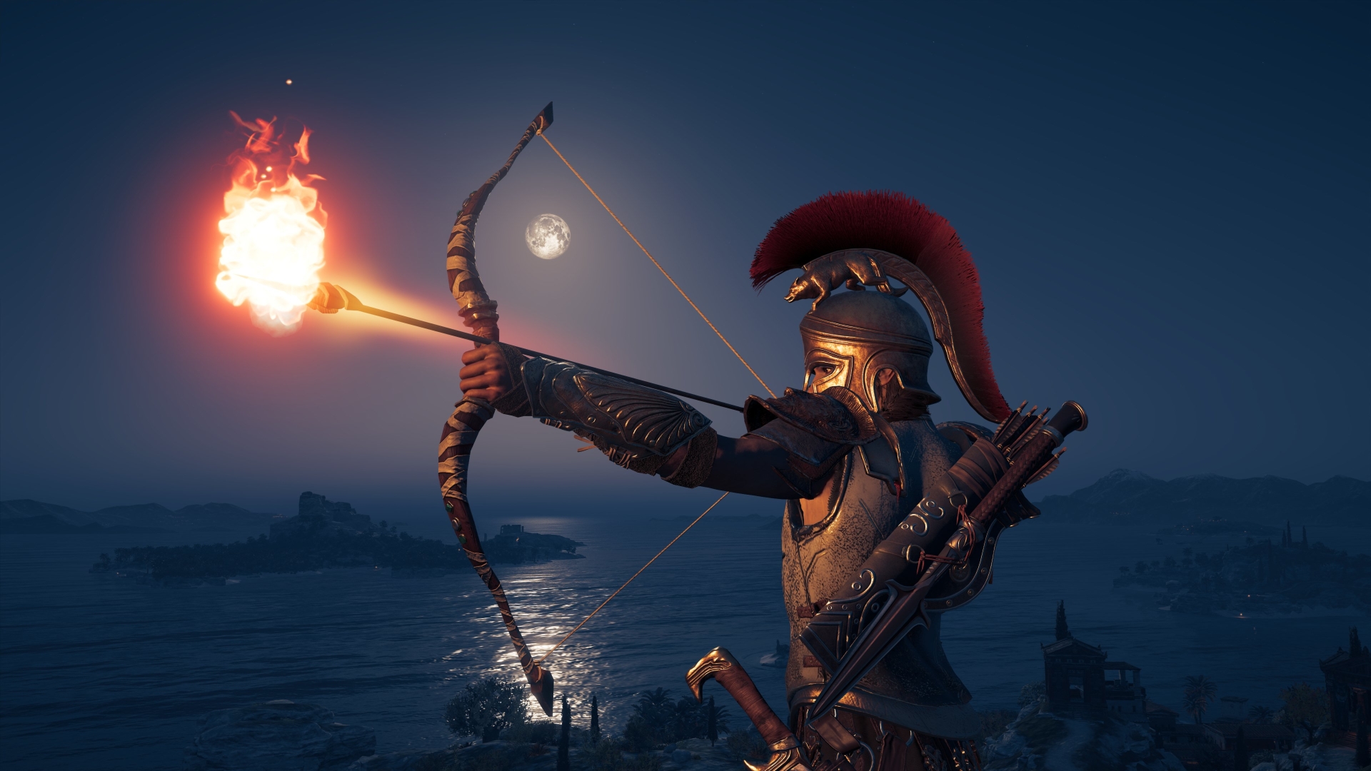Description: A man in a helmet holding a bow and arrow in front of a fire ball and a body of water.