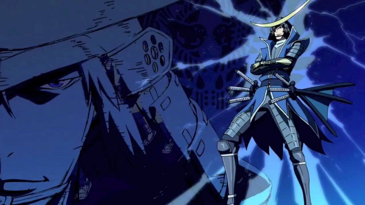 Description: A man in armor standing next to a giant demon with a sword in his hand and lightning in the background.