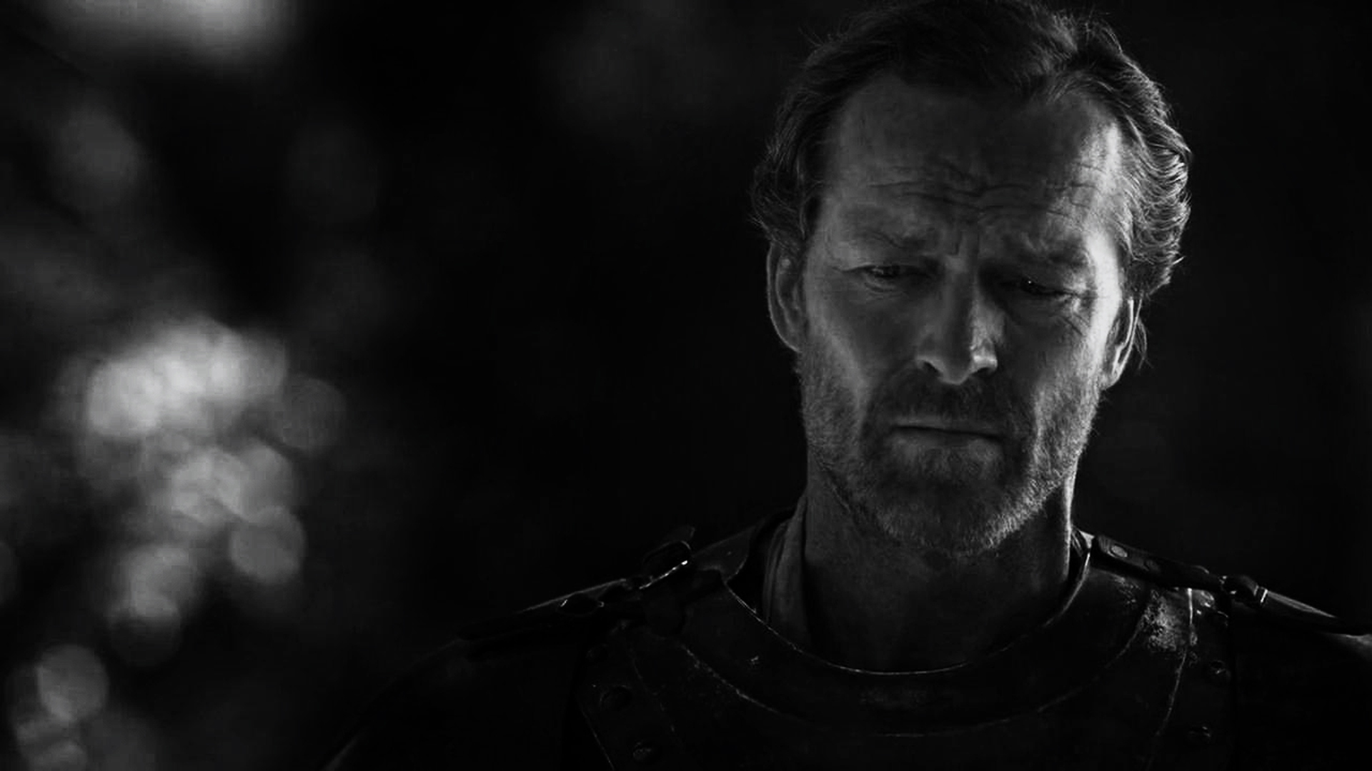 Description: A man in armor looking at something with a serious look on his face and shoulders.
