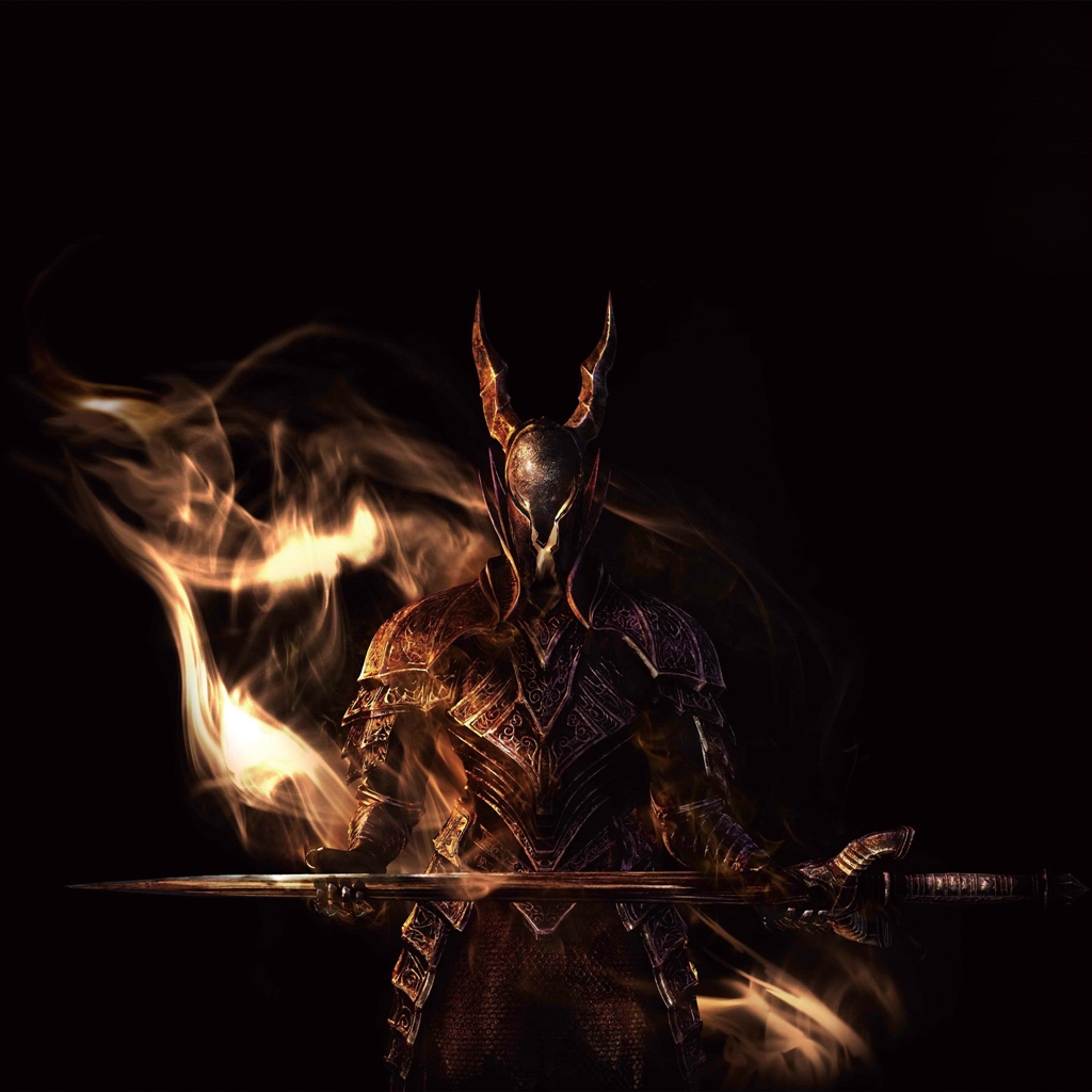 Description: A man in armor holding a sword and fire in the dark background with a black background behind him and a black background behind him.