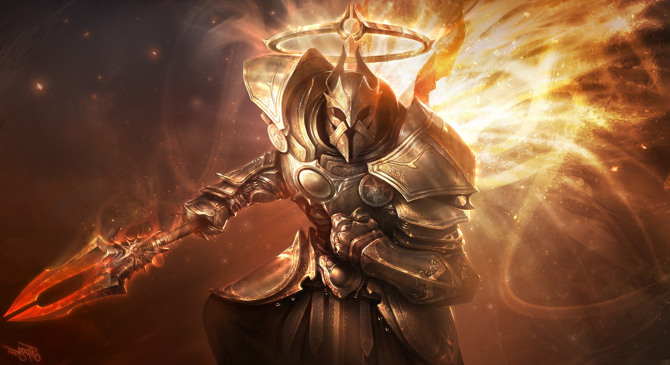 Description: A man in a armor holding a sword and a flamey background with a fireball in the background.