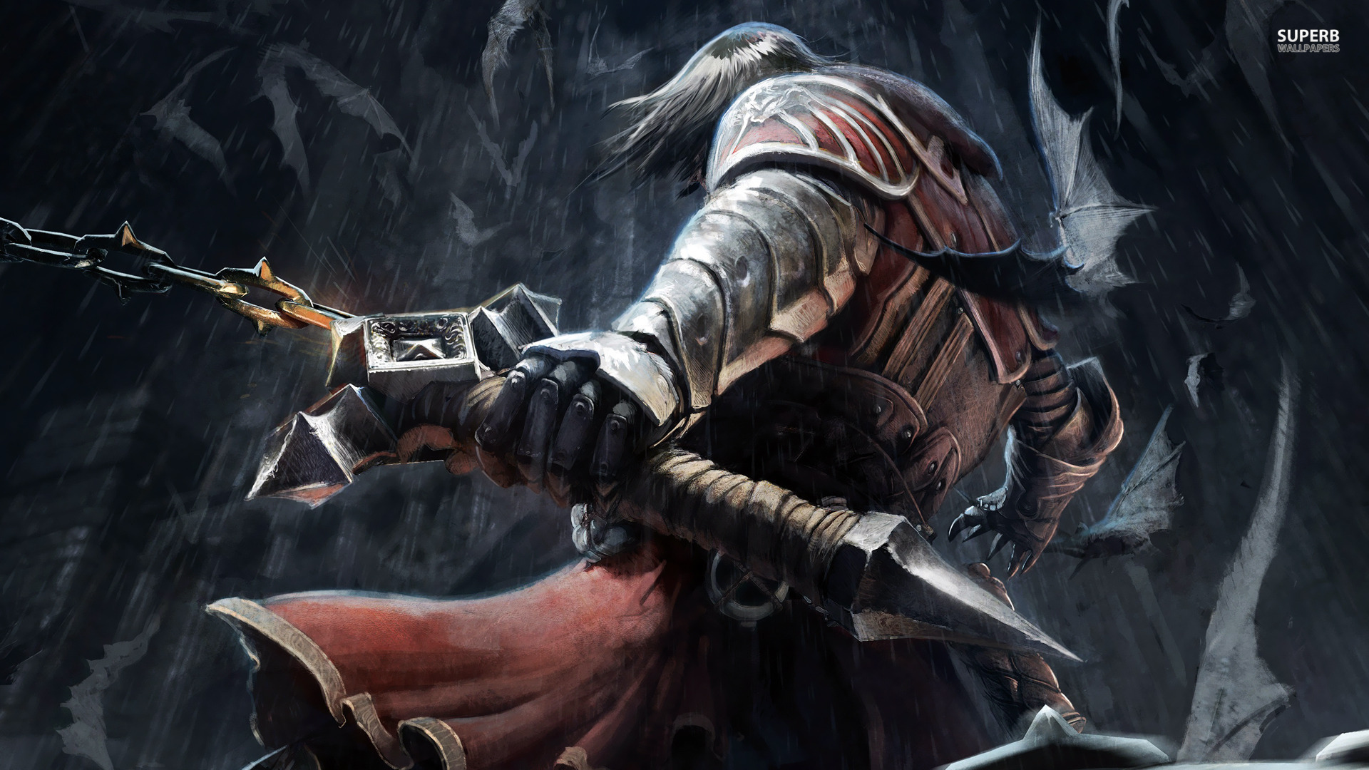 Description: A man in armor holding a sword in the rain with a chain on his arm and a chain on his shoulder.