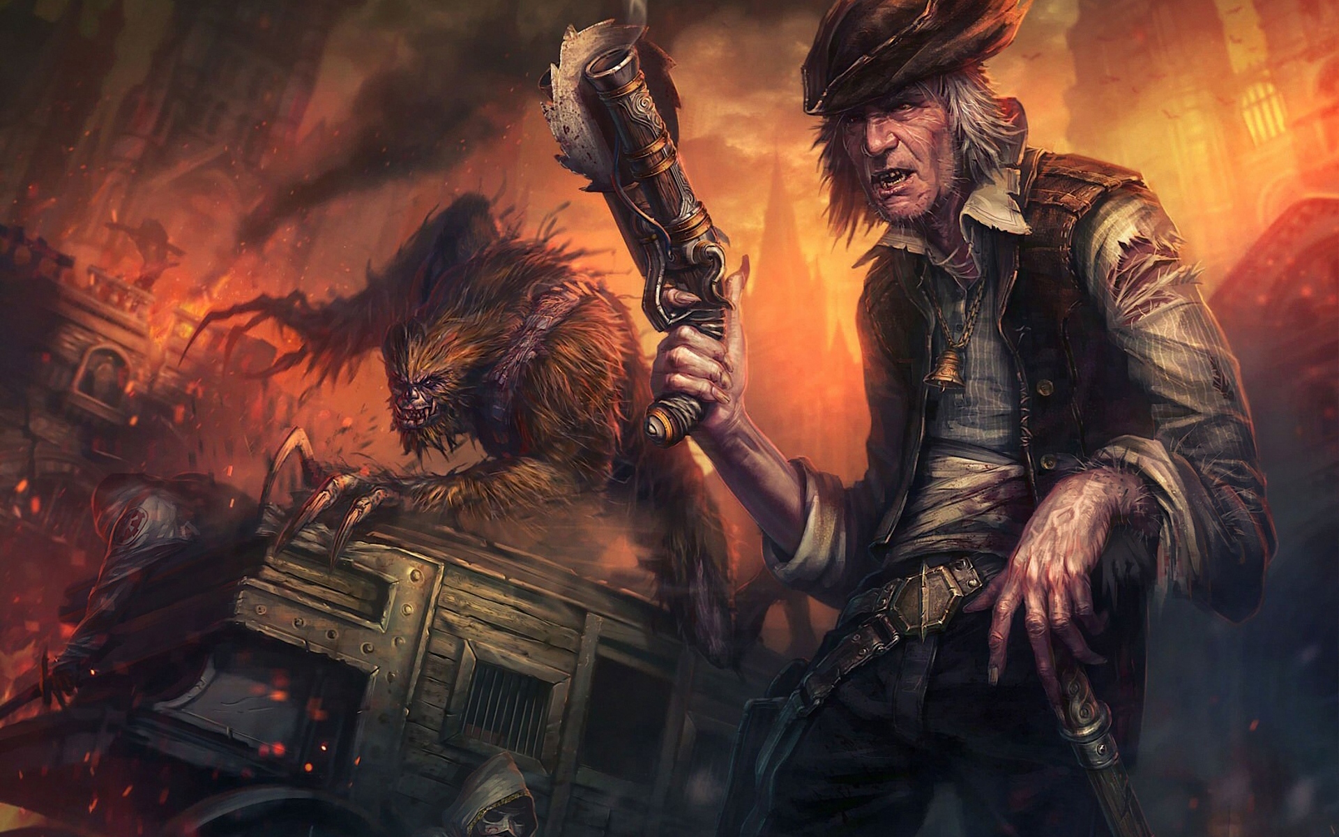 Description: A man holding a giant axe in a dark city with a demon on it's back and a demon on his arm.