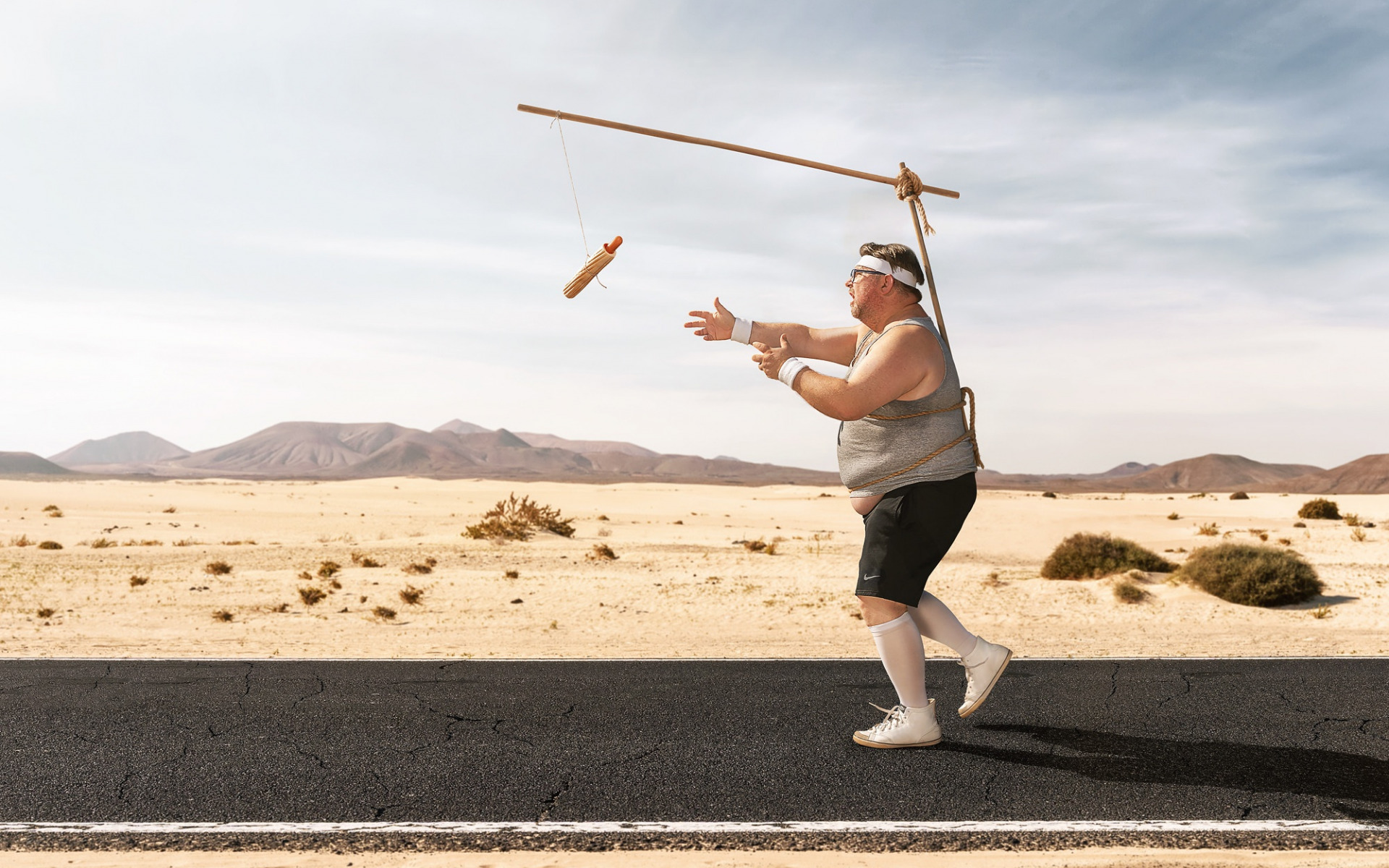 Description: A man is balancing on a pole in the middle of the road with a stick in his hand and a baseball bat in his other hand.