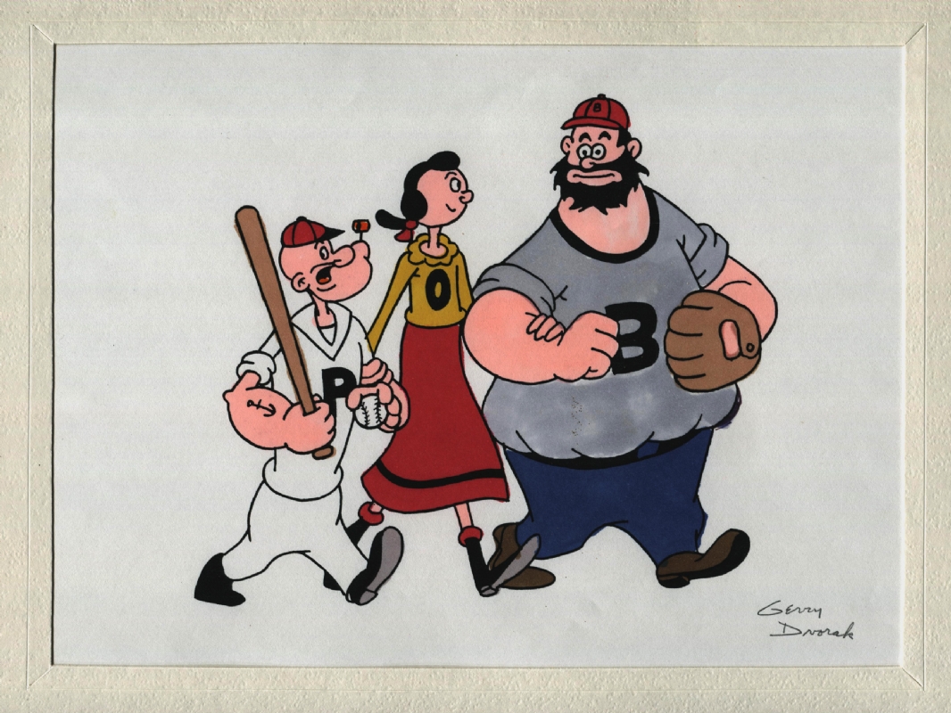 Description: A drawing of a man holding a baseball bat and a ball with two other men behind him and a woman holding a baseball bat.