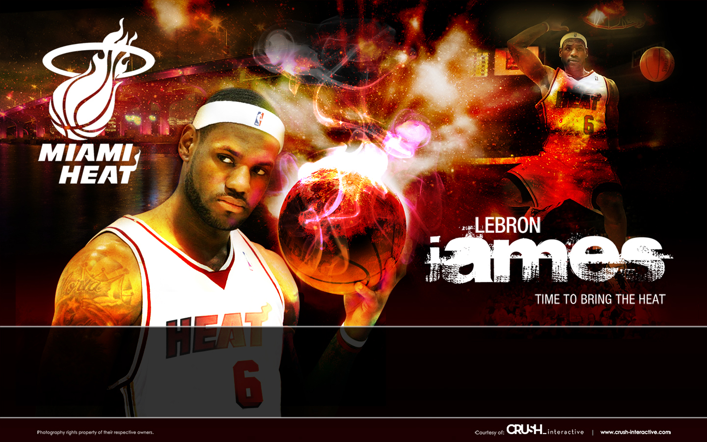 Description: A man holding a basketball in his right hand and a miami heat logo on the left hand and a basketball in his left hand.