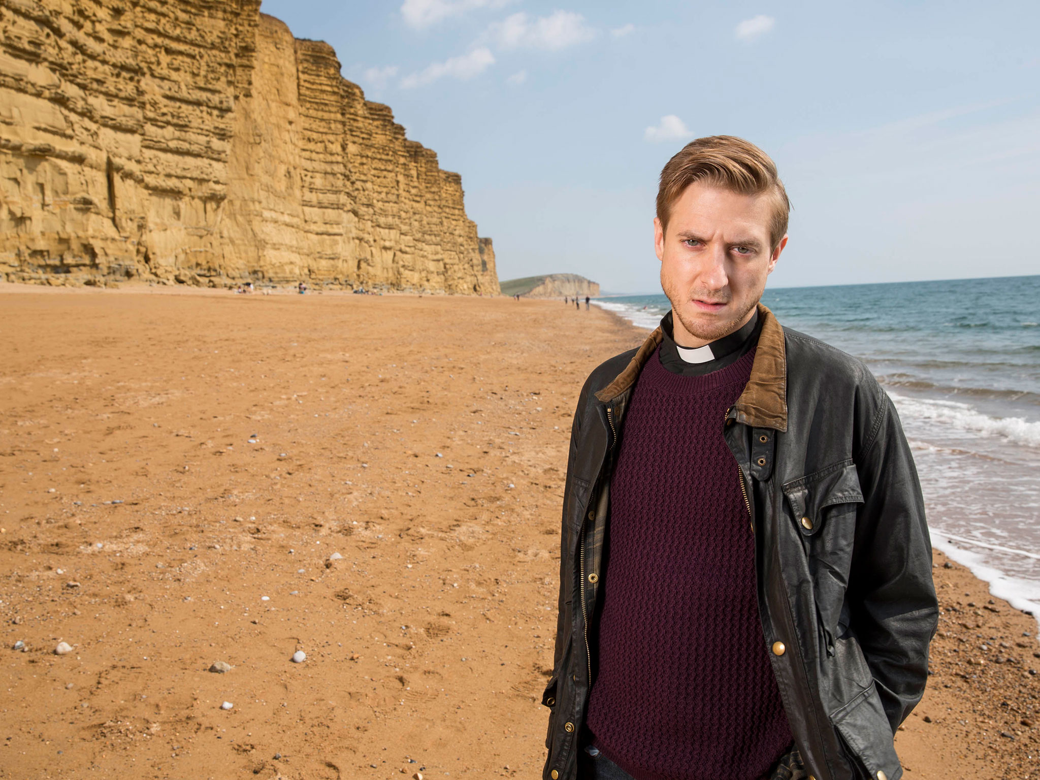 Description: A man standing on a beach next to the ocean with a cliff in the background and a person standing on the beach.
